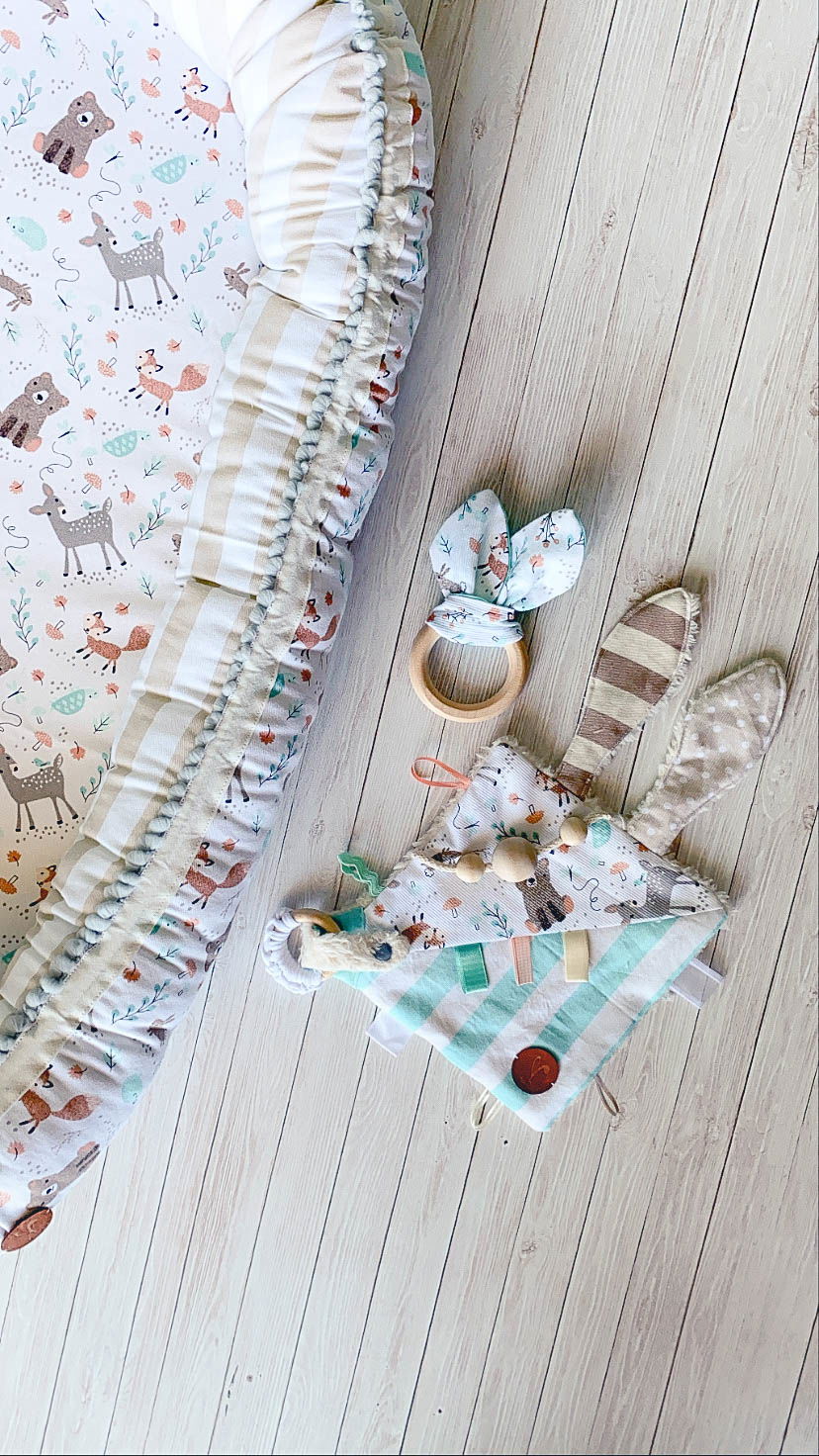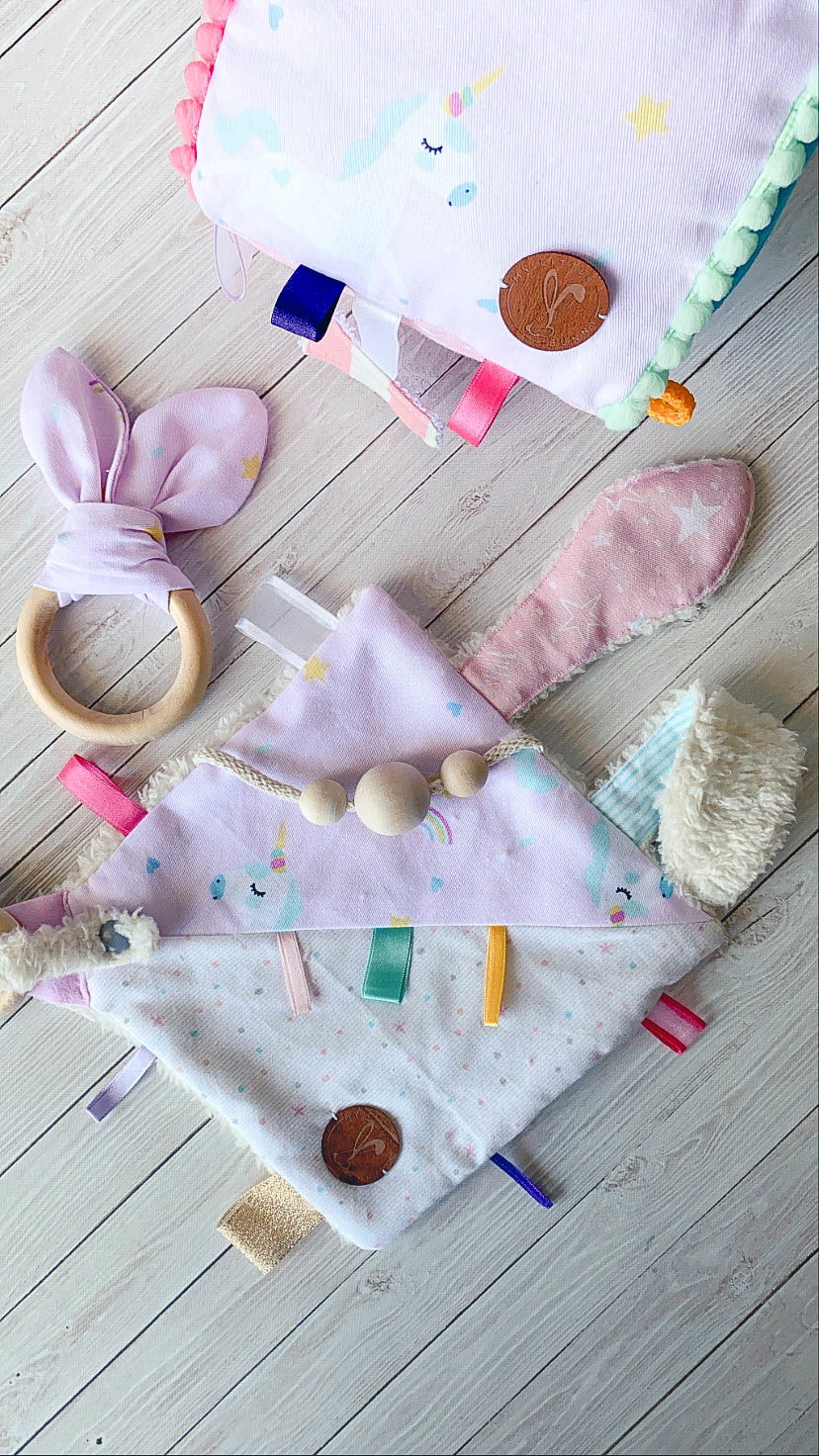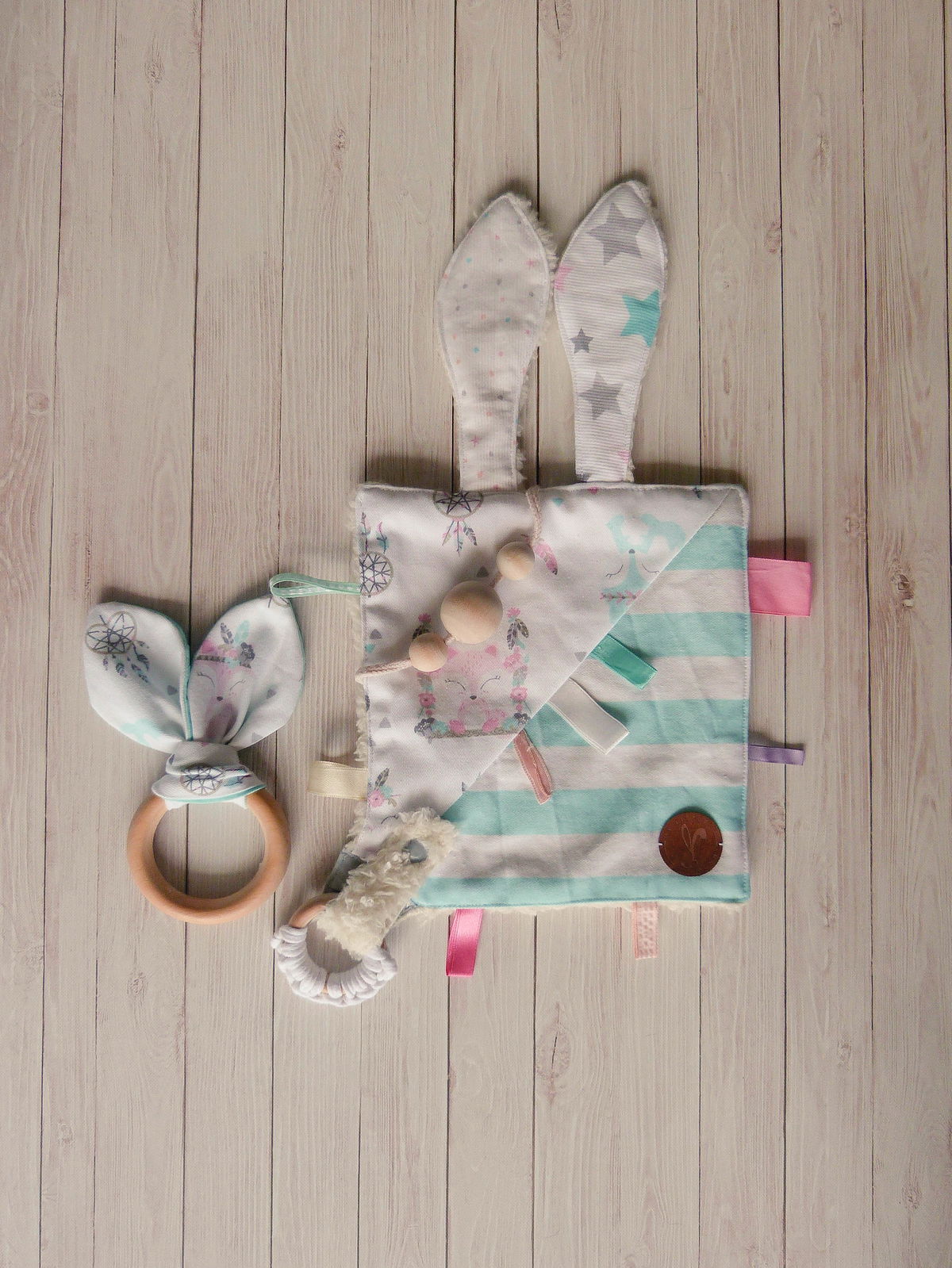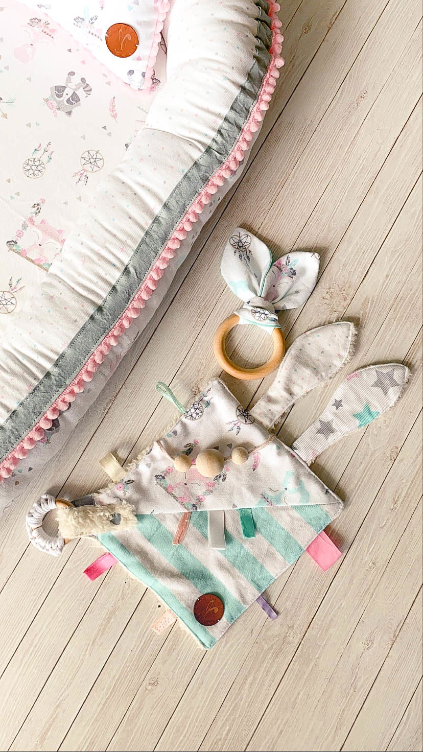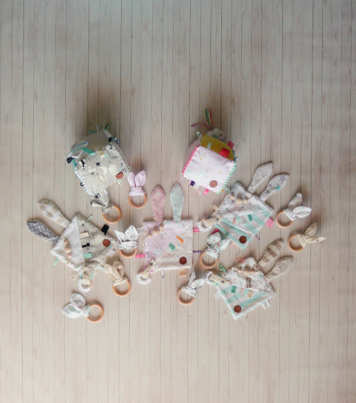 Trapito de apego con distintas Texturas, esferas de madera natural sin barnices, cintas y orejas. Medidas 20 cm x 20 cm (sin incluir orejas).