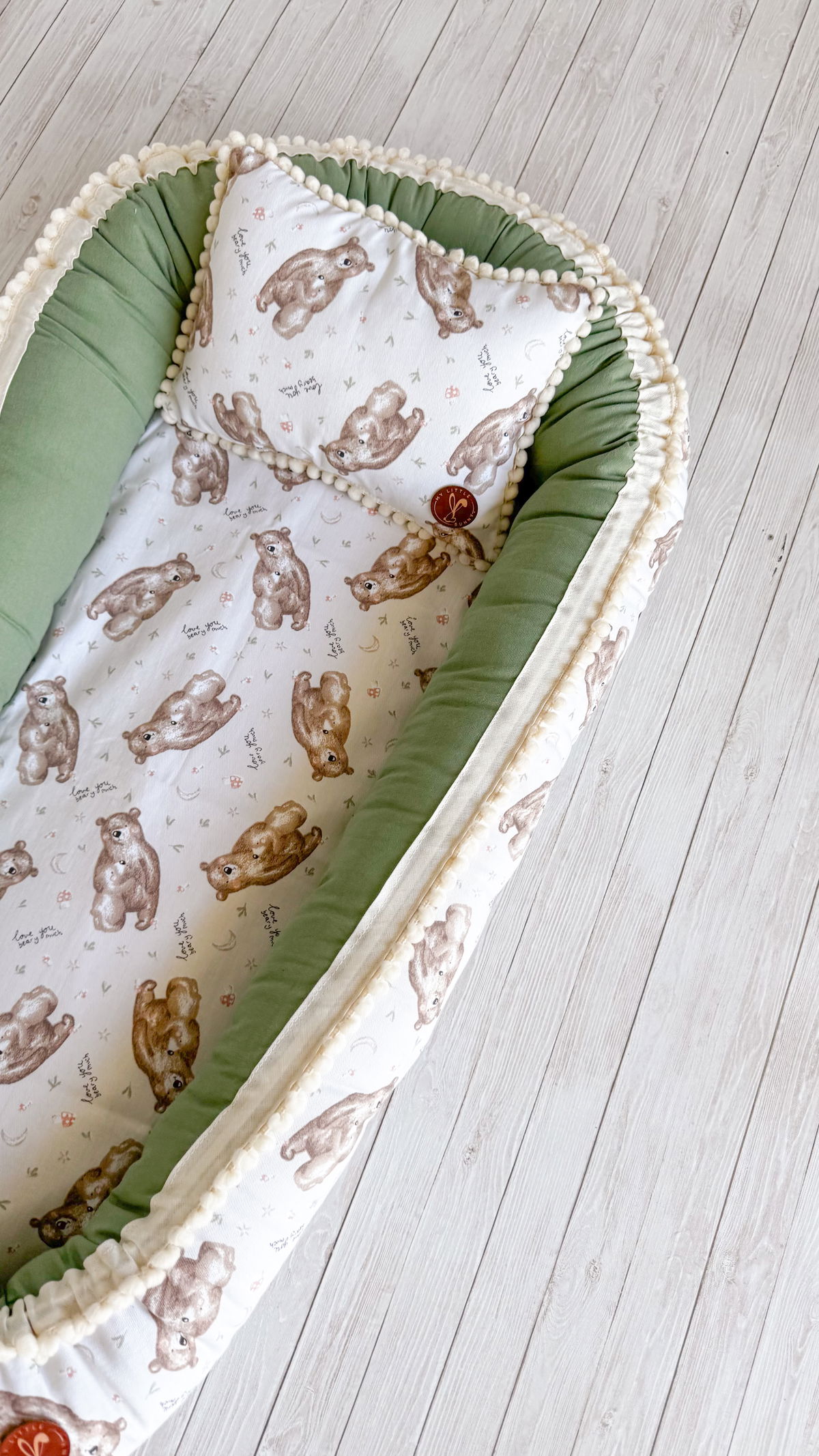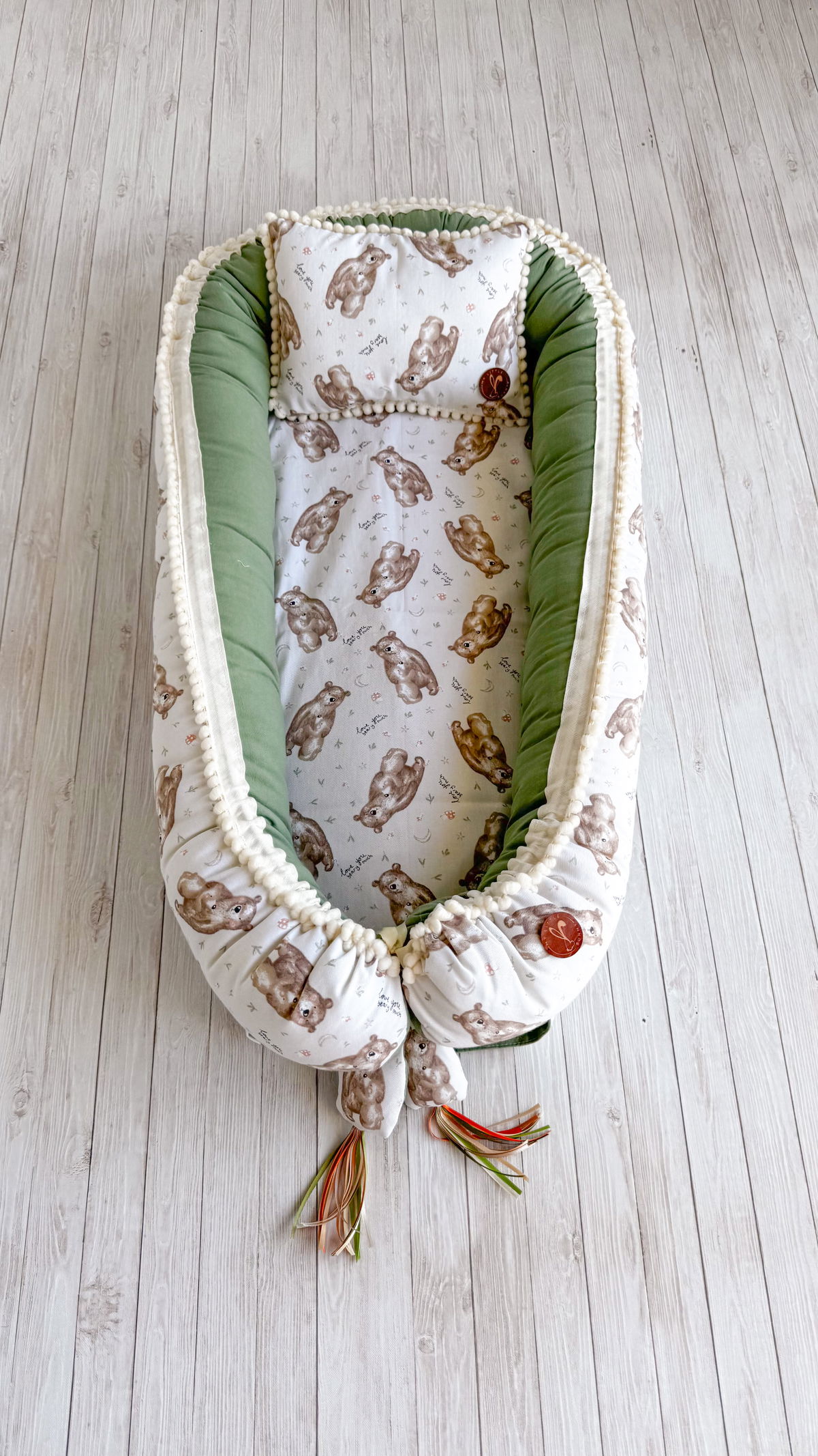 Tiene detalles como biez, cinta de doble razo y pompones, los terminales son 2 piezas rellenitas con cintitas haciendo juego con el nido.