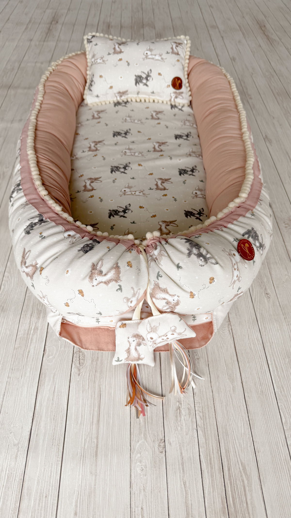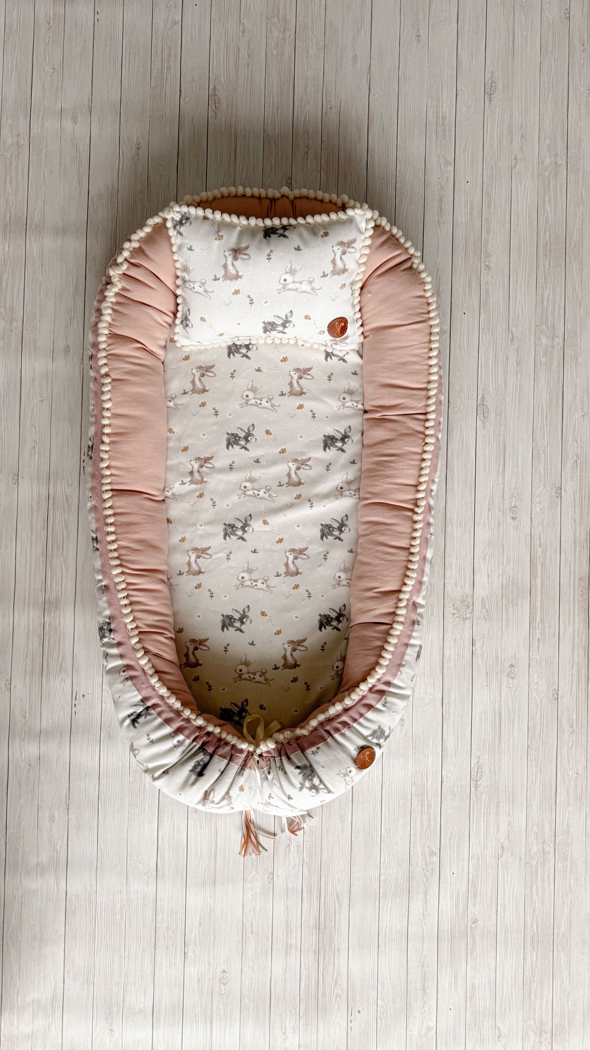 Tiene detalles como biez, cinta de doble razo y pompones, los terminales son 2 piezas rellenitas con cintitas haciendo juego con el nido.