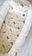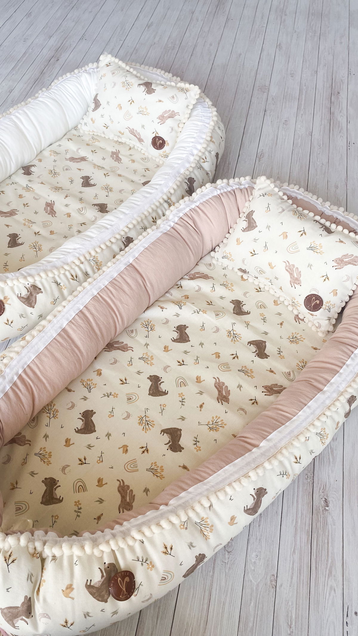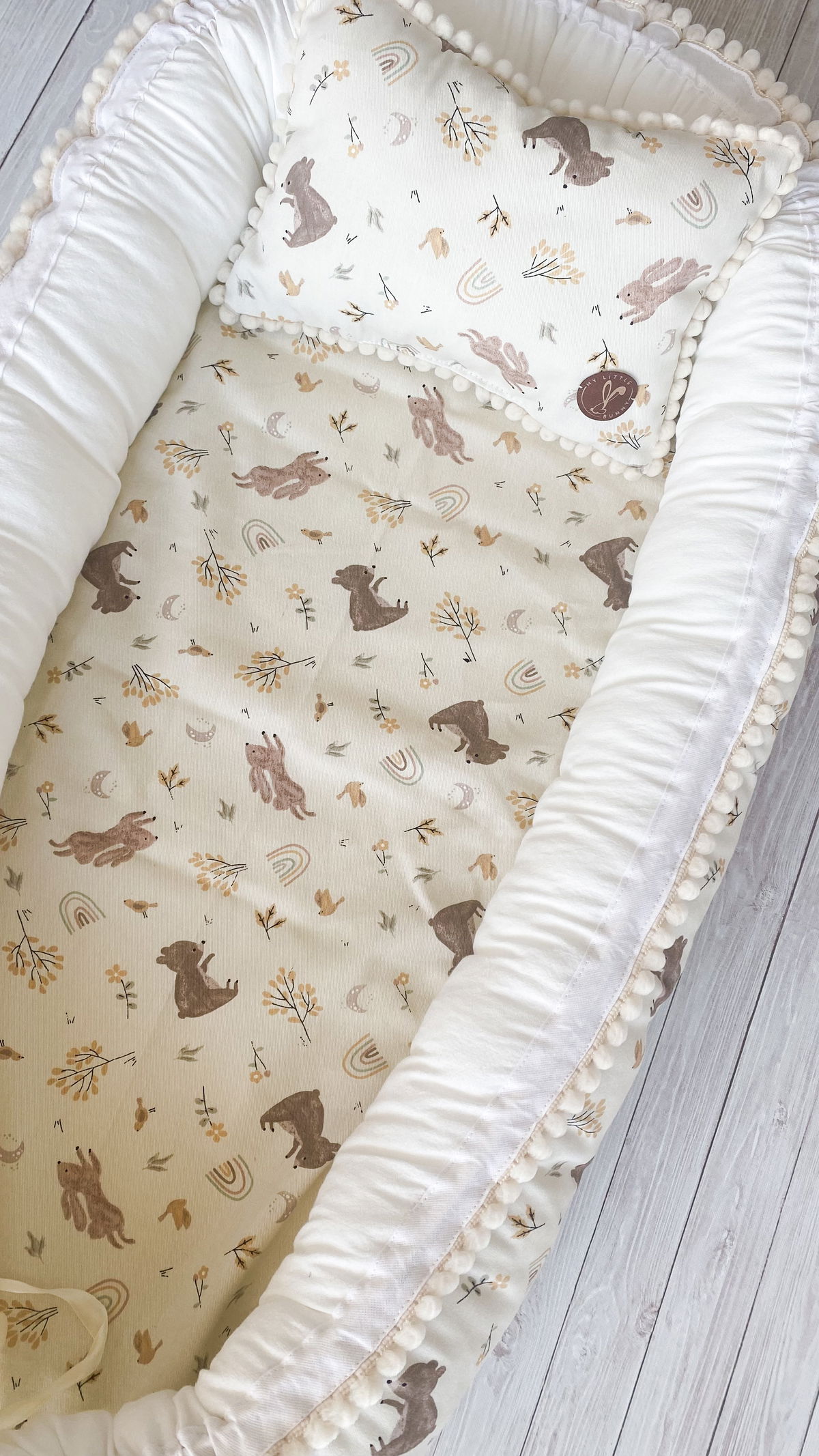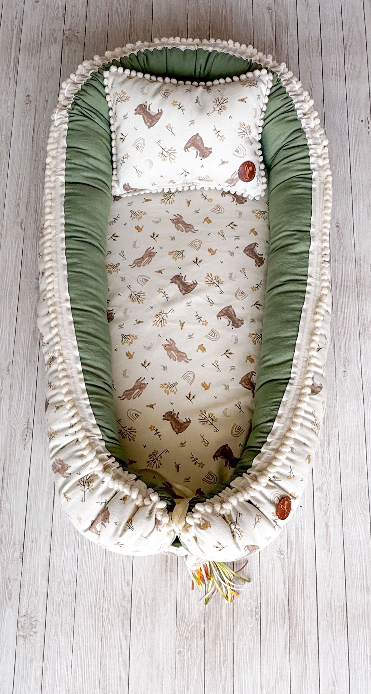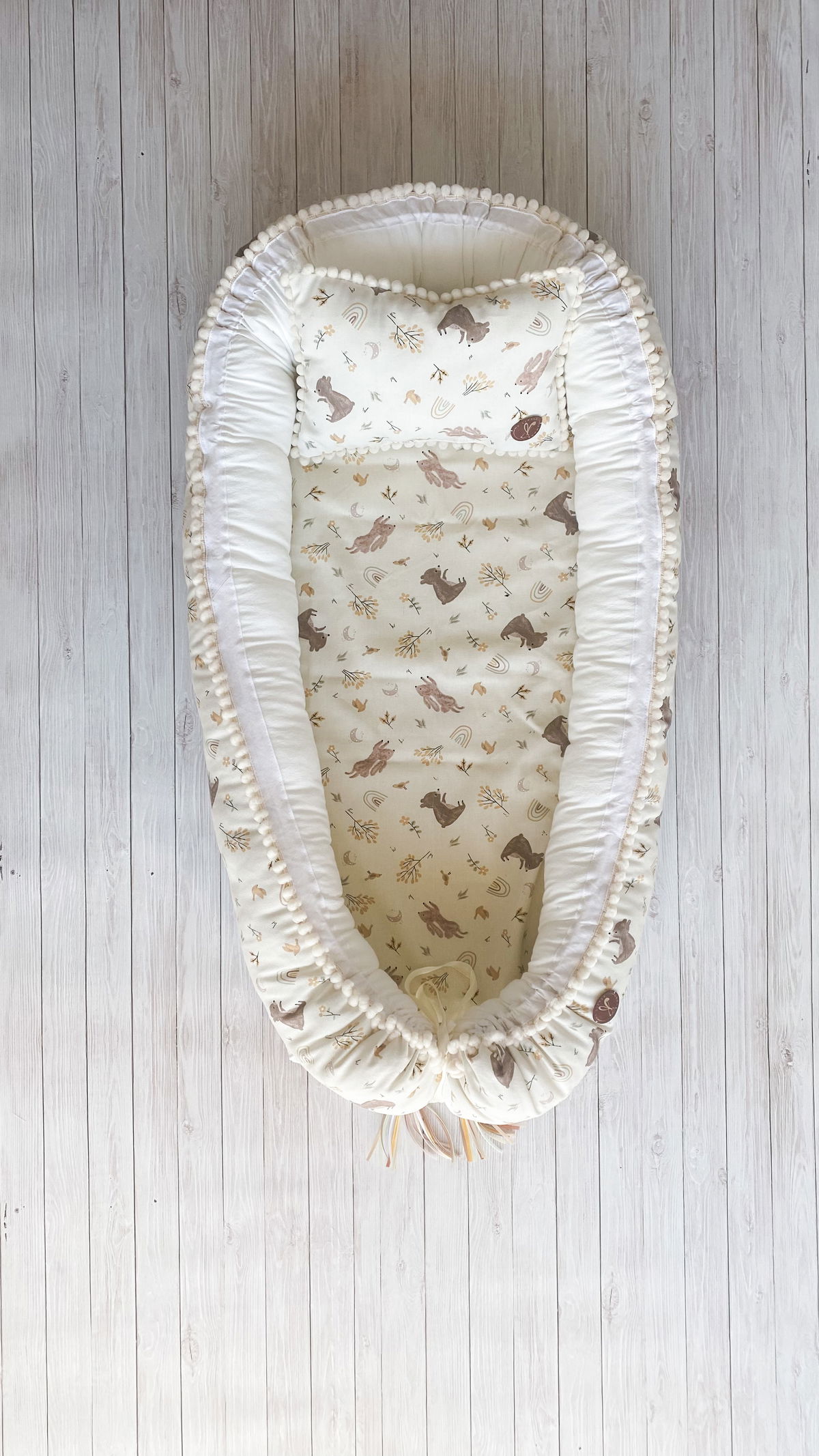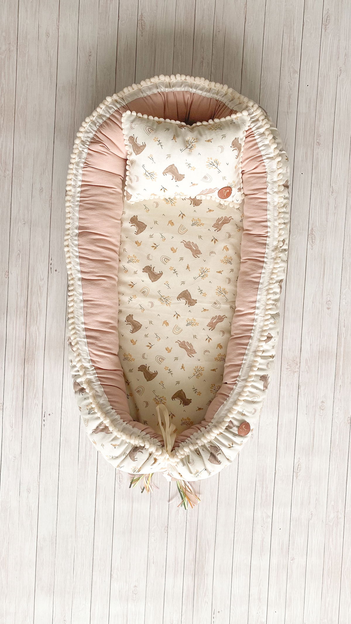 Tiene detalles como biez, cinta de doble razo y pompones, los terminales son 2 piezas rellenitas con cintitas haciendo juego con el nido.