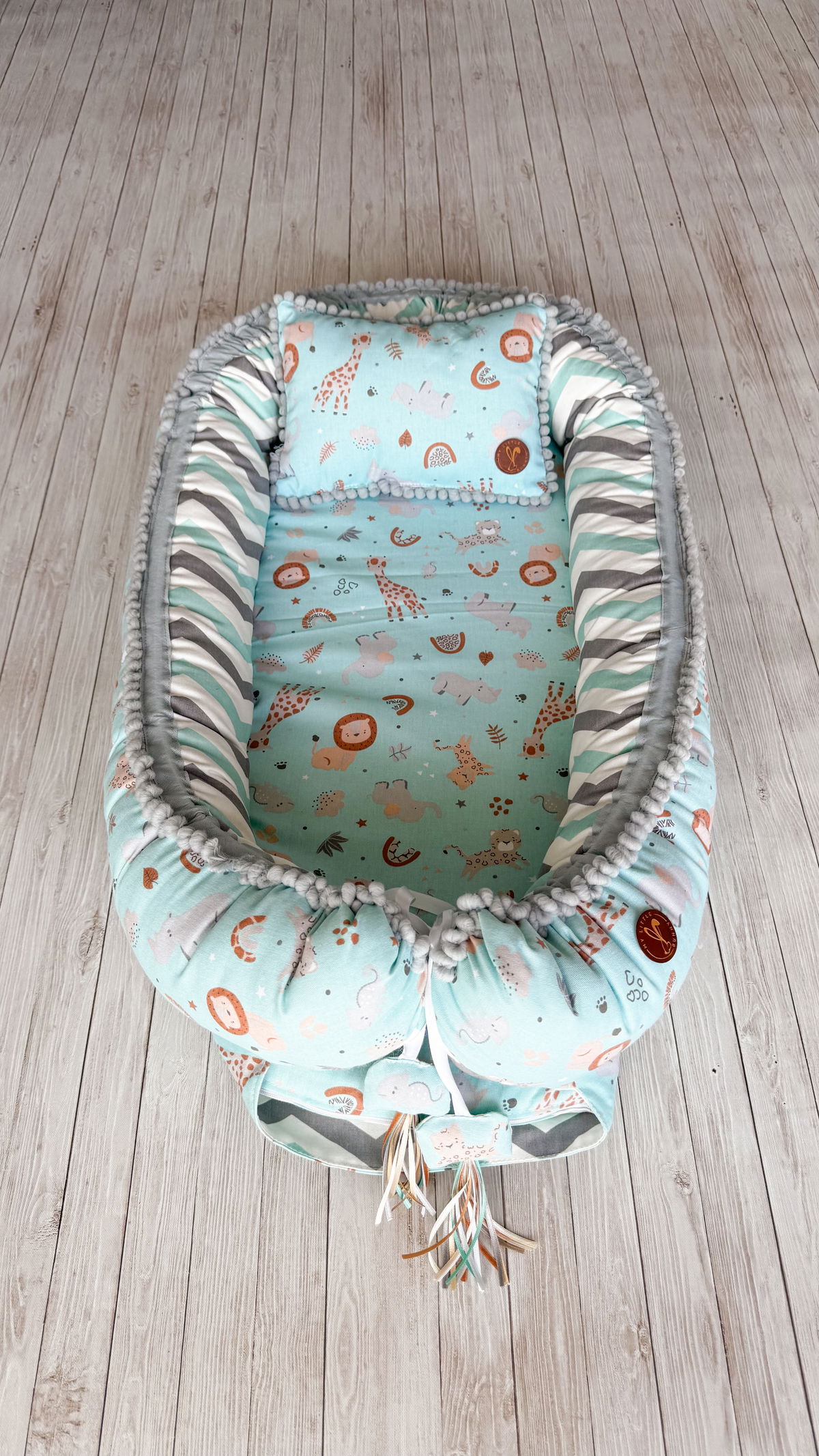 Tiene detalles como biez, cinta de doble razo y pompones, los terminales son 2 piezas rellenitas con cintitas haciendo juego con el nido.