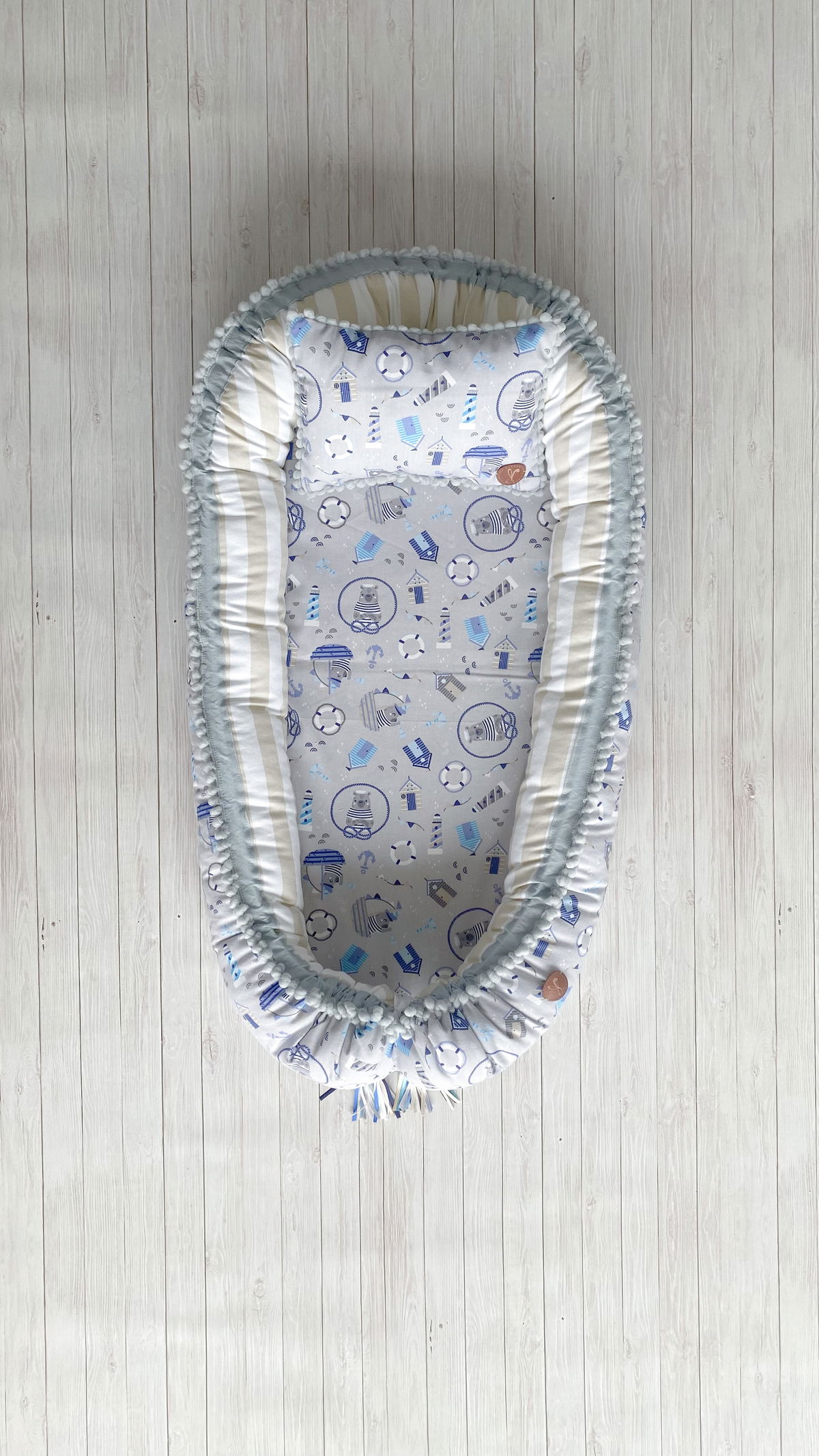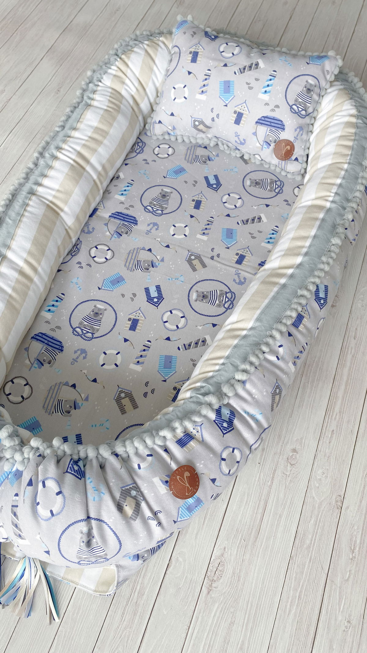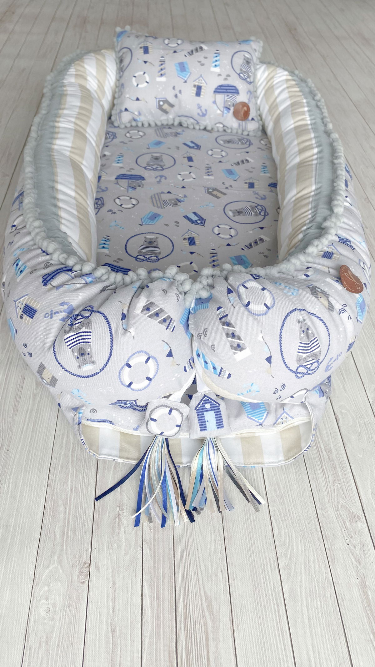 Tiene detalles como biez, cinta de doble razo y pompones, los terminales son 2 piezas rellenitas con cintitas haciendo juego con el nido.