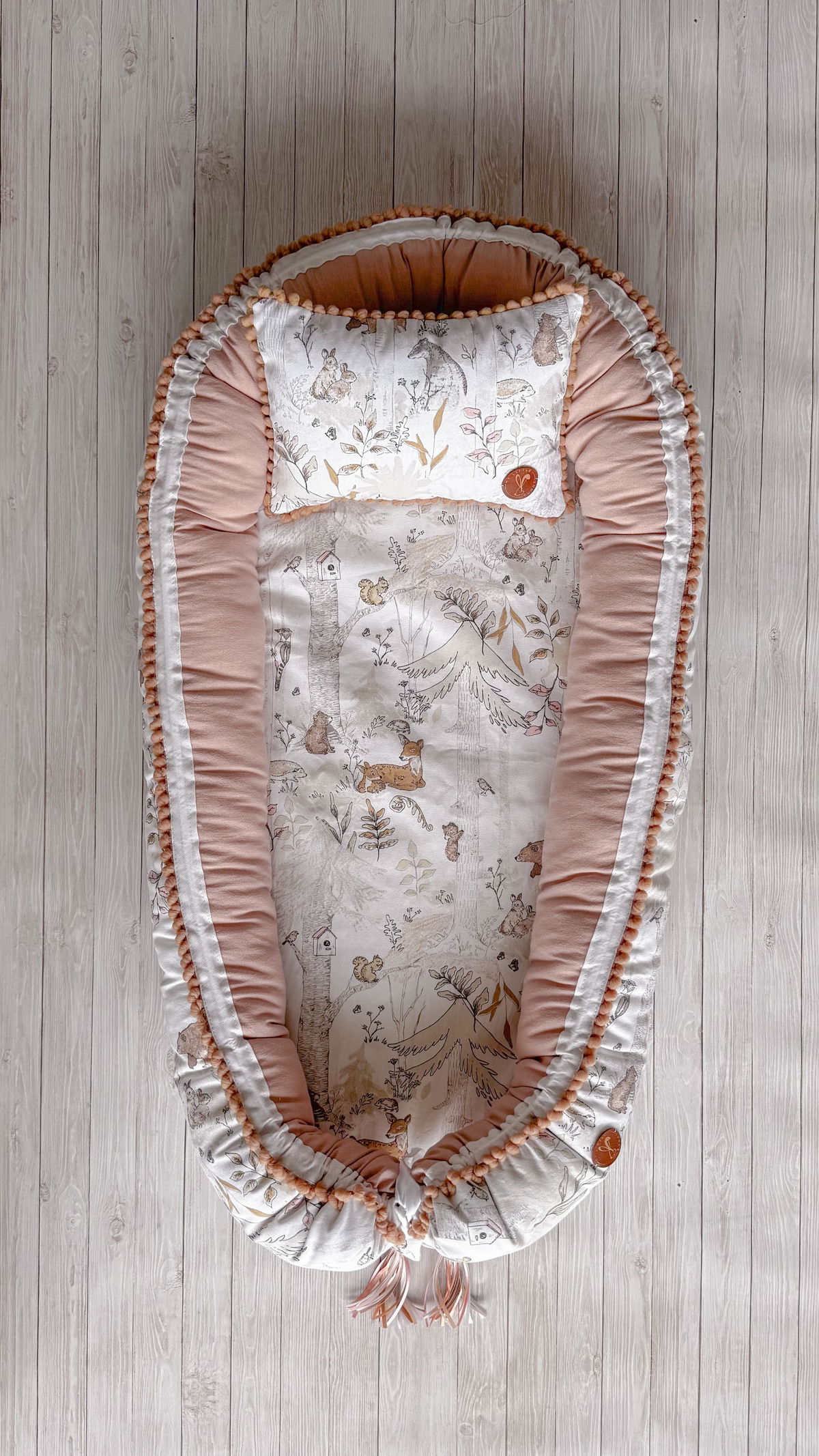 Tiene detalles como biez, cinta de doble razo y pompones, los terminales son 2 piezas rellenitas con cintitas haciendo juego con el nido.