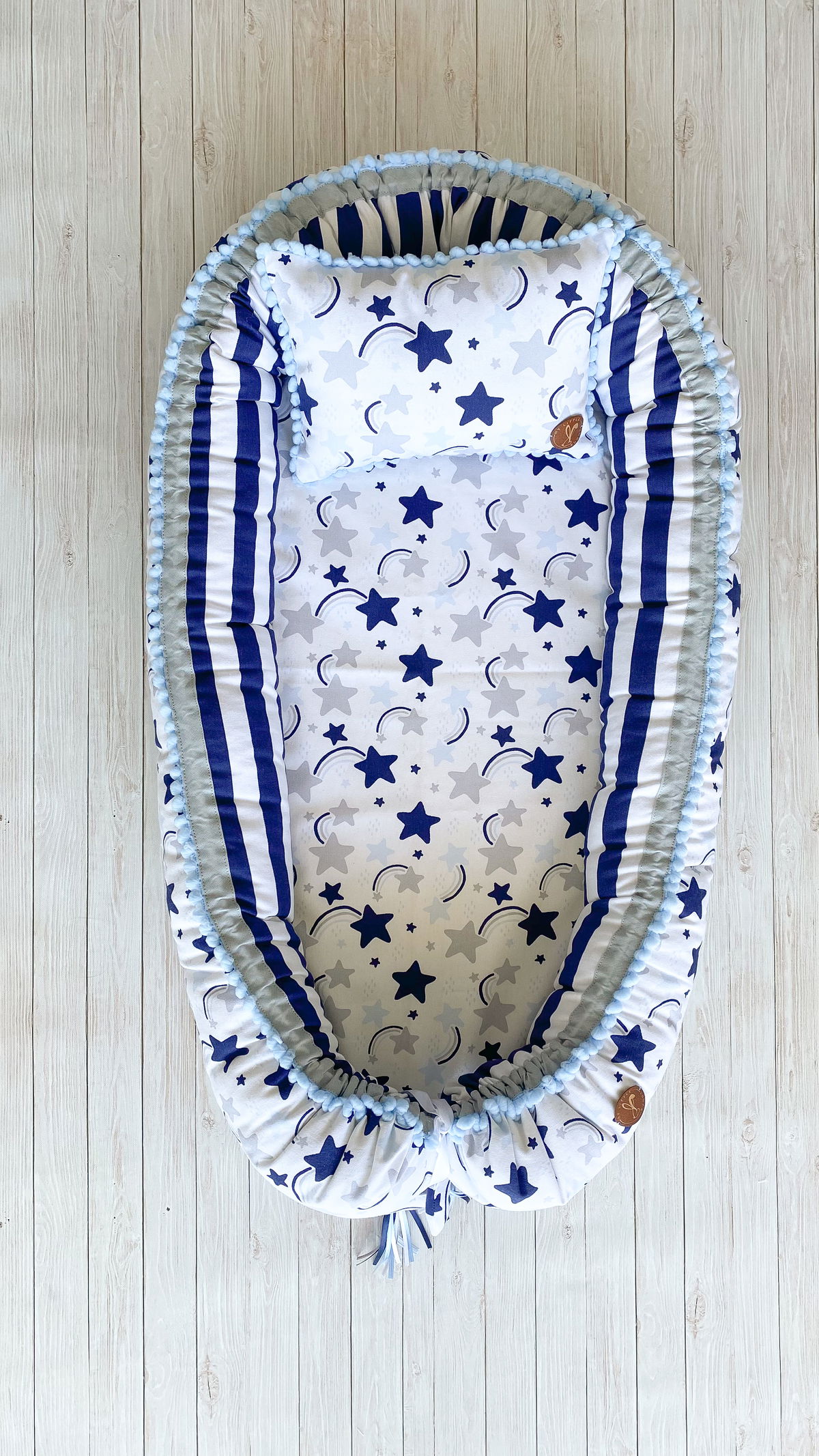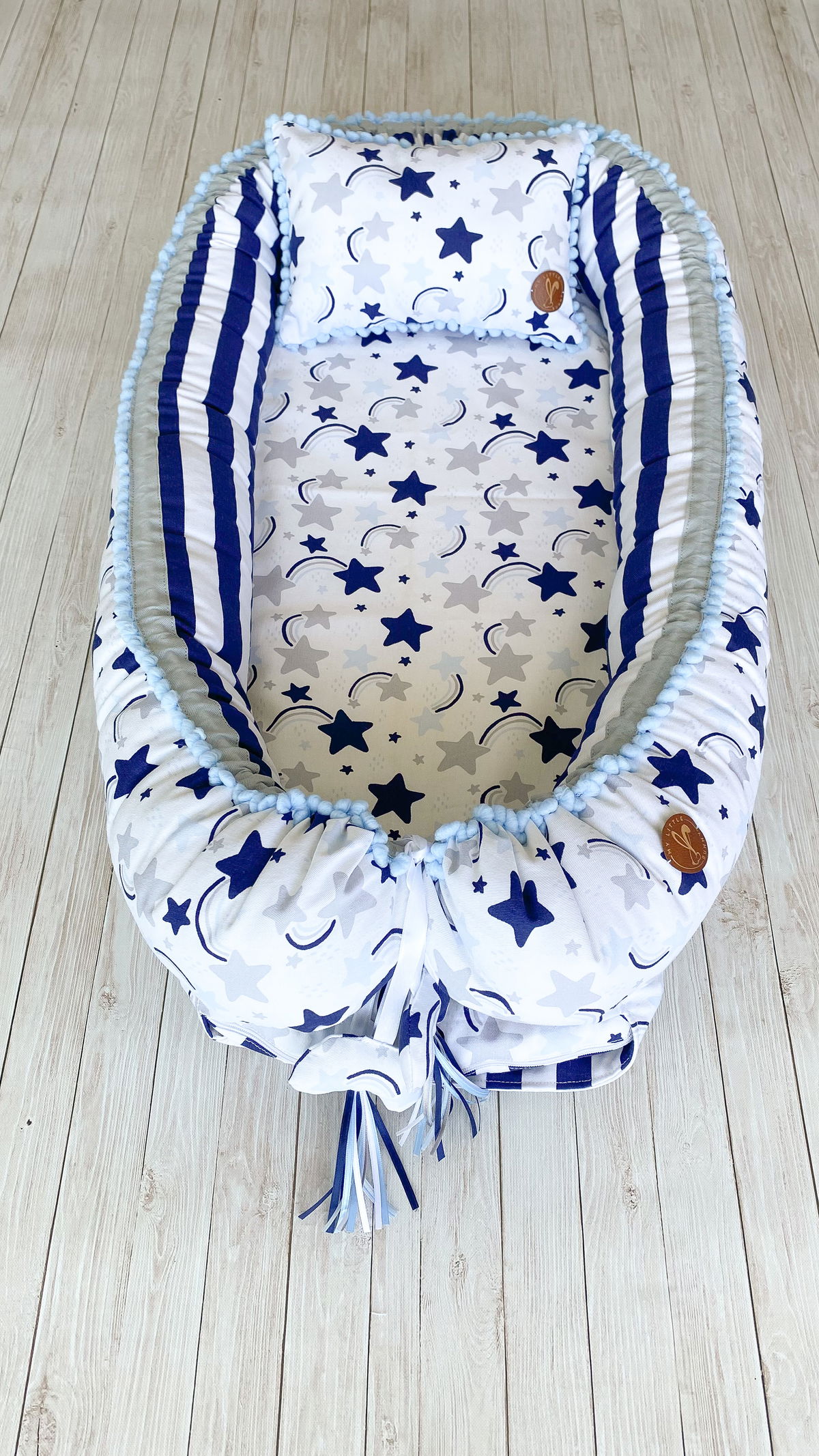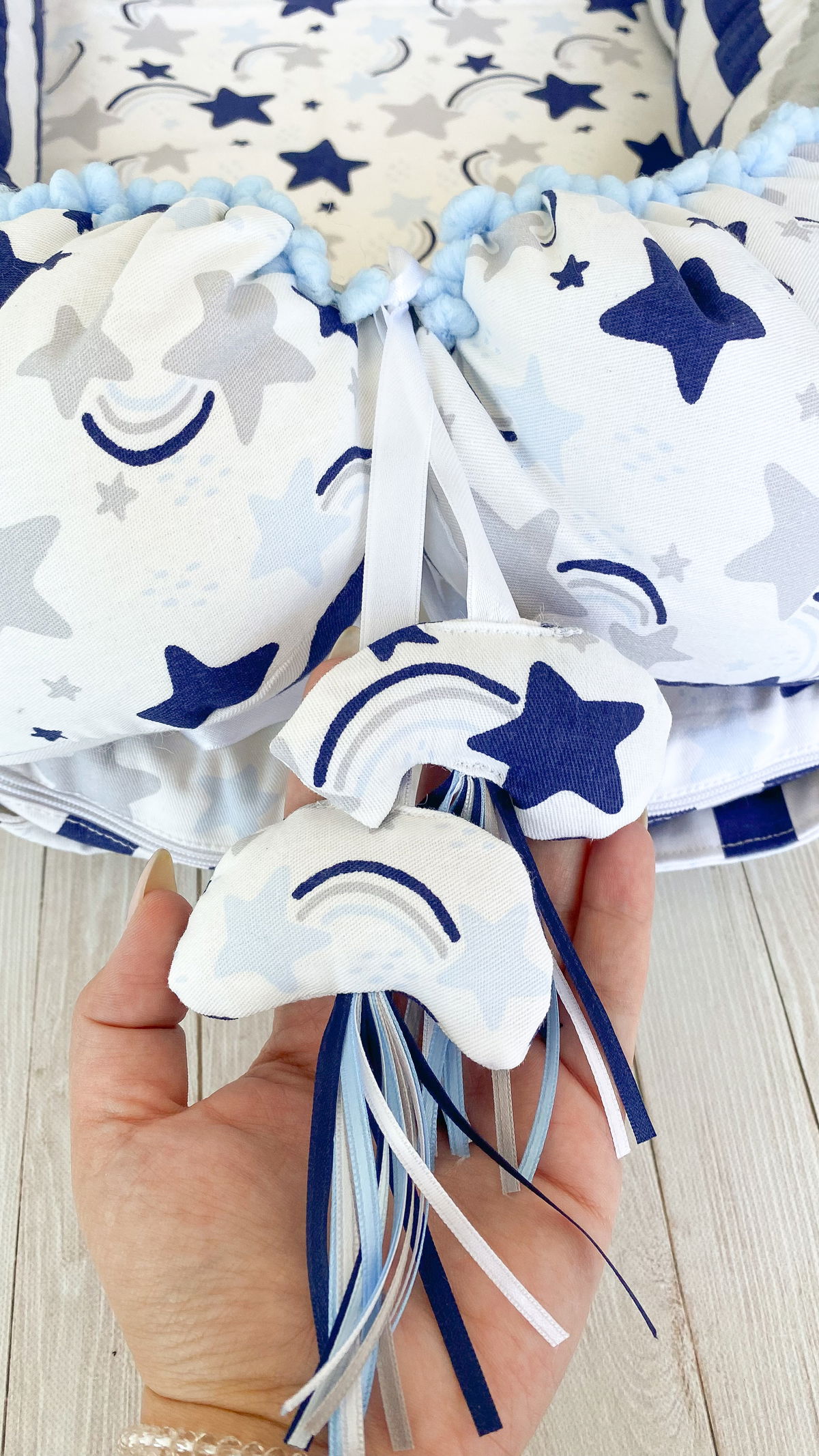 Tiene detalles como biez, cinta de doble razo y pompones, los terminales son 2 piezas rellenitas con cintitas haciendo juego con el nido.