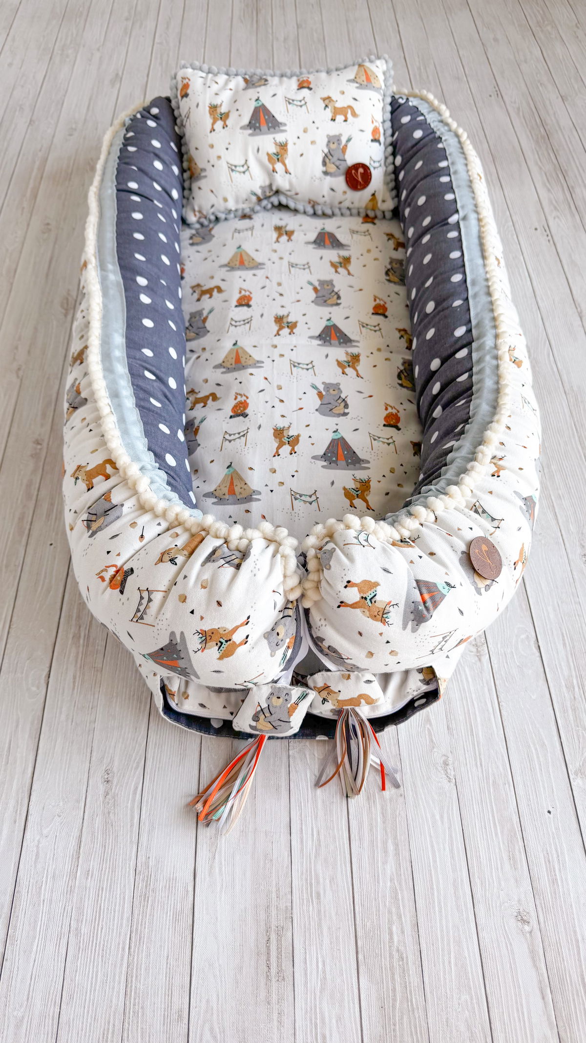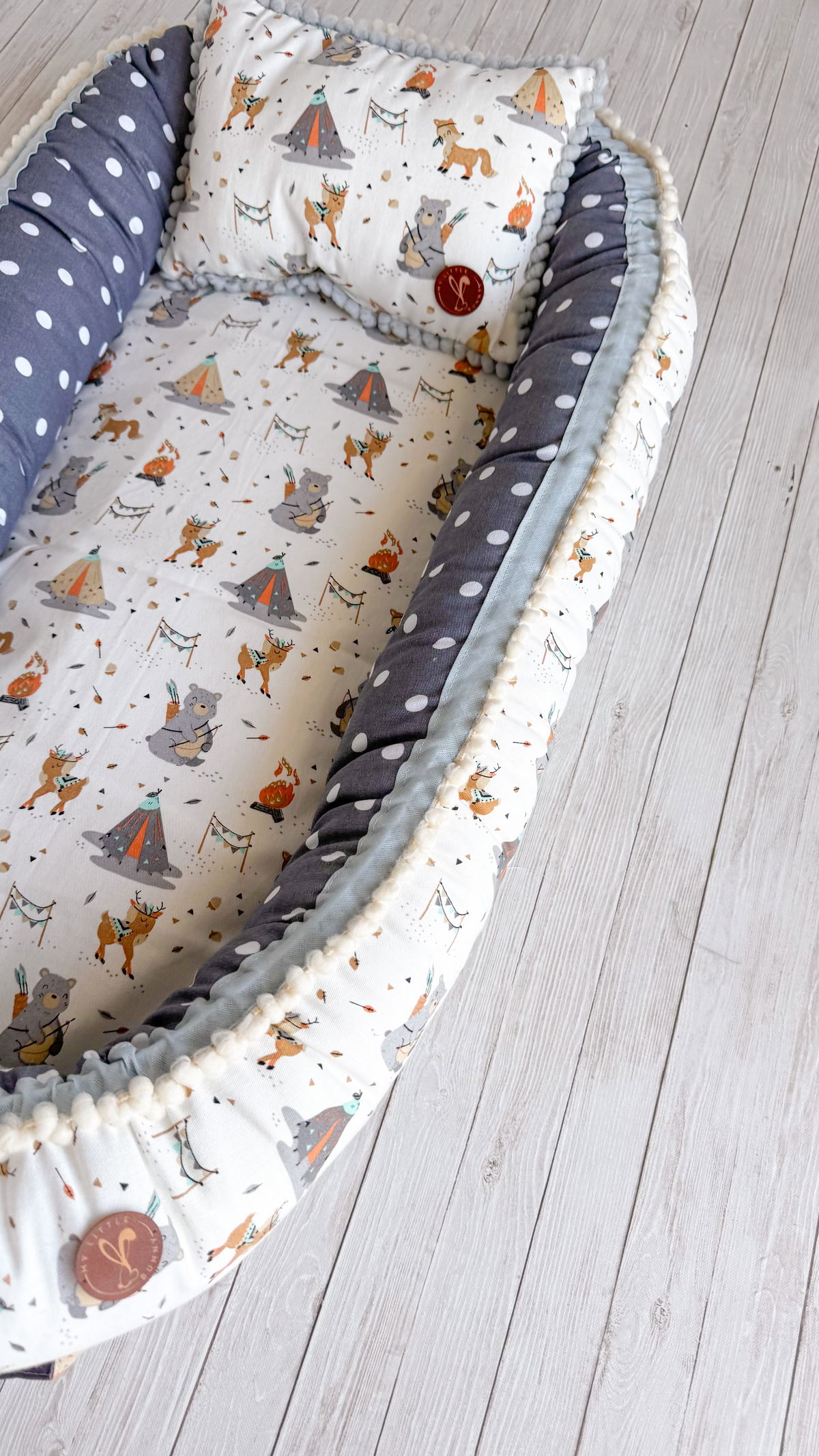 Tiene detalles como biez, cinta de doble razo y pompones, los terminales son 2 piezas rellenitas con cintitas haciendo juego con el nido.