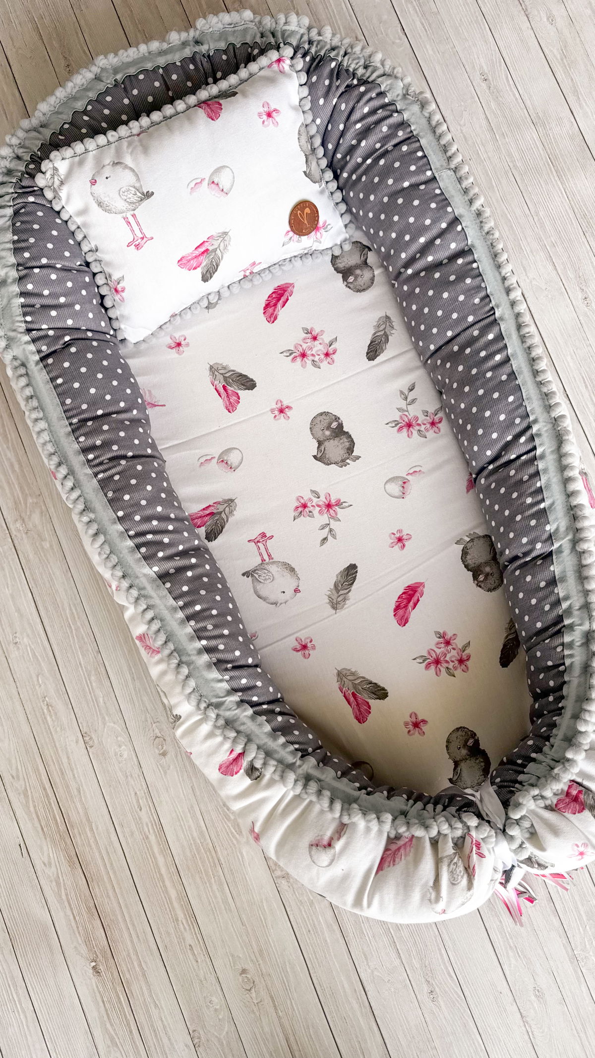 Tiene detalles como biez, cinta de doble razo y pompones, los terminales son 2 piezas rellenitas con cintitas haciendo juego con el nido.