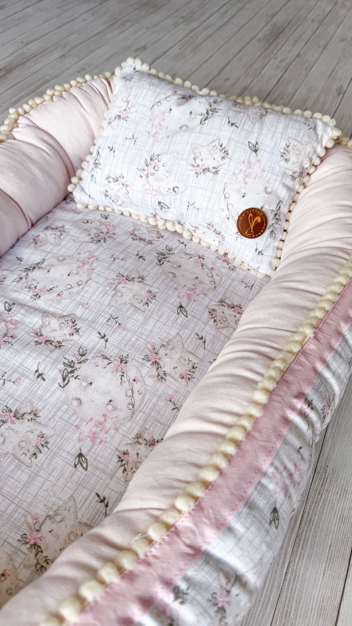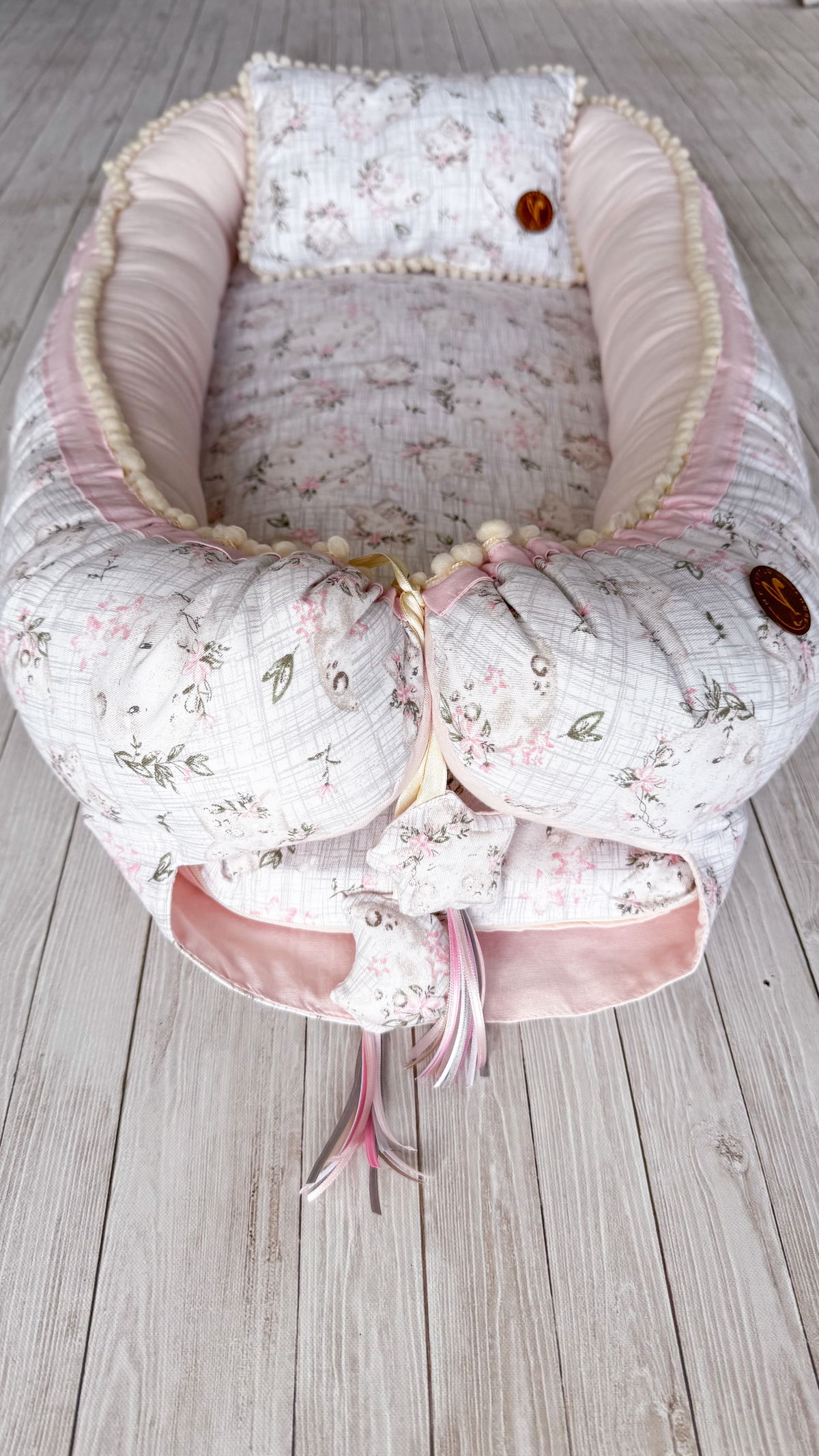 Tiene detalles como biez, cinta de doble razo y pompones, los terminales son 2 piezas rellenitas con cintitas haciendo juego con el nido.