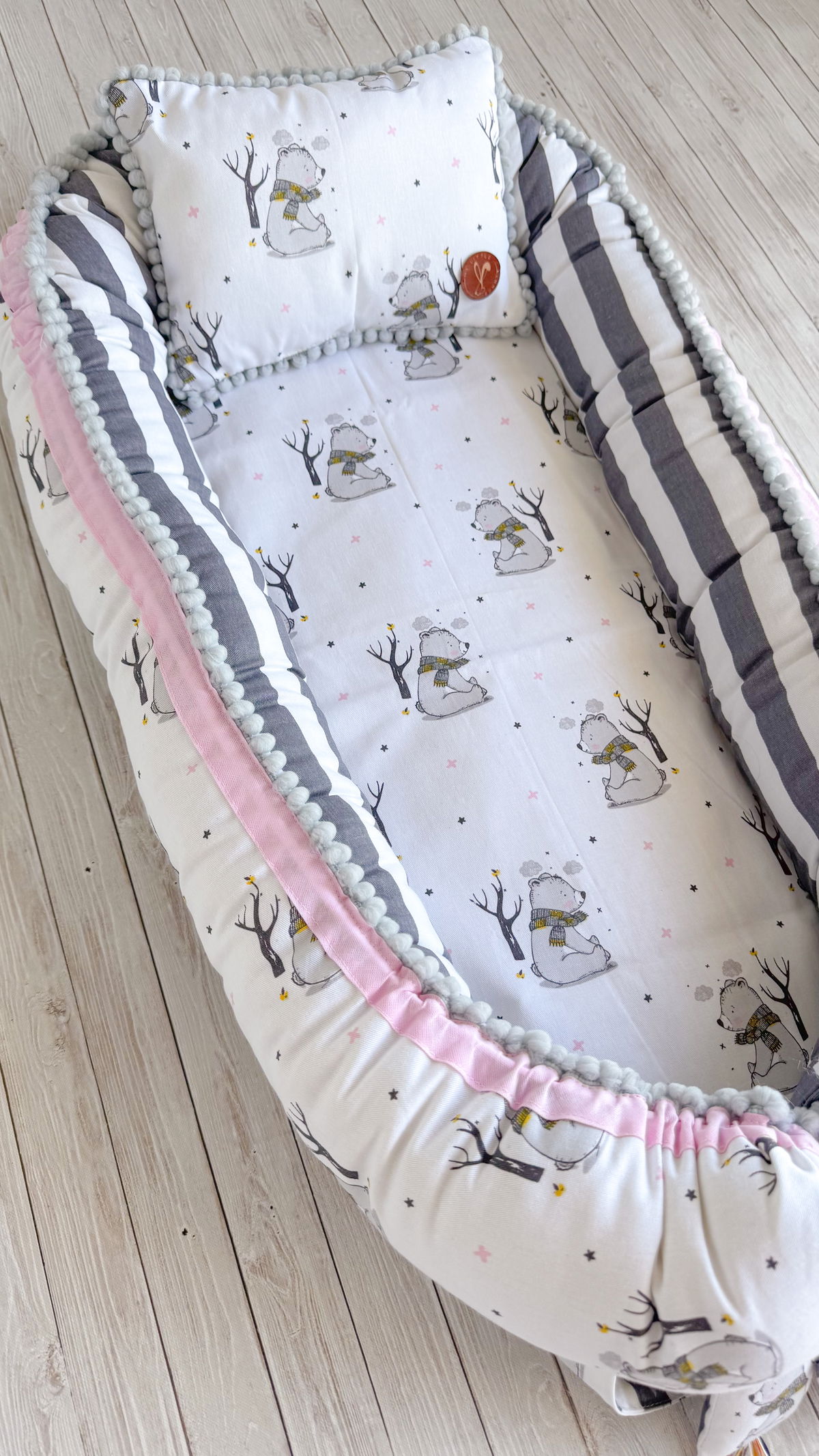 Tiene detalles como biez, cinta de doble razo y pompones, los terminales son 2 piezas rellenitas con cintitas haciendo juego con el nido.