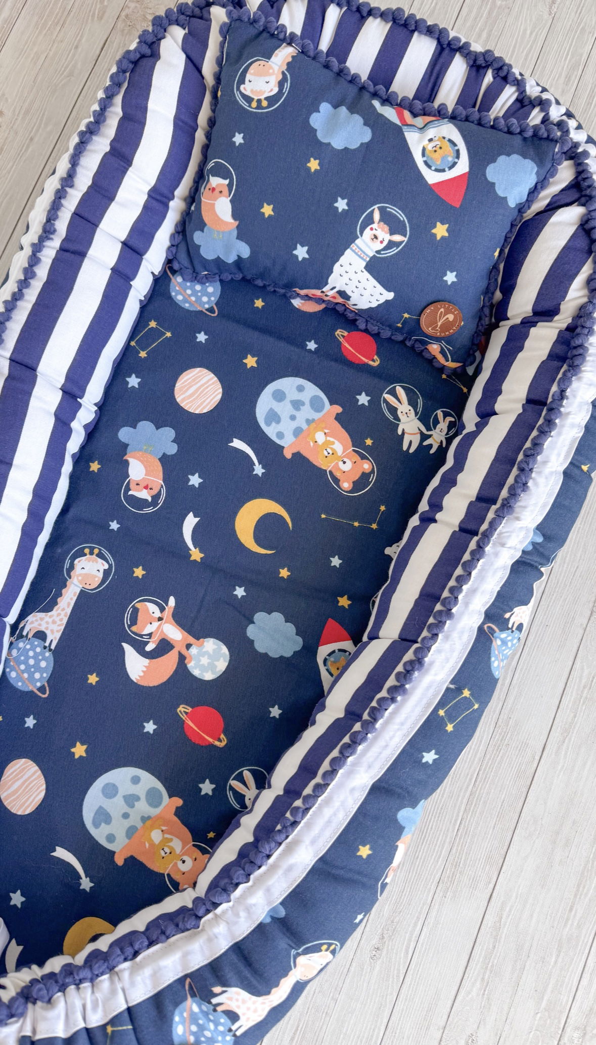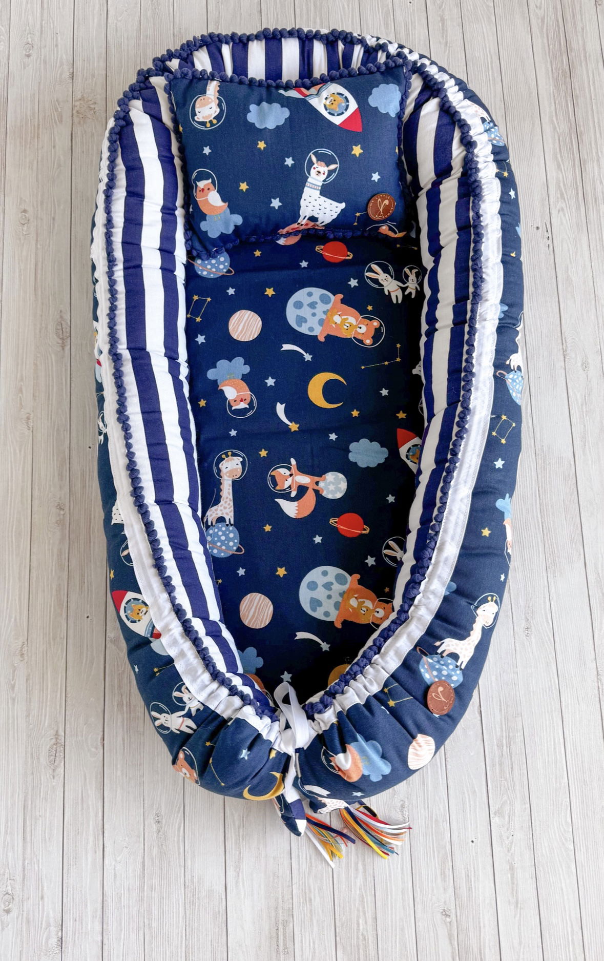 Tiene detalles como biez, cinta de doble razo y pompones, los terminales son 2 piezas rellenitas con cintitas haciendo juego con el nido.