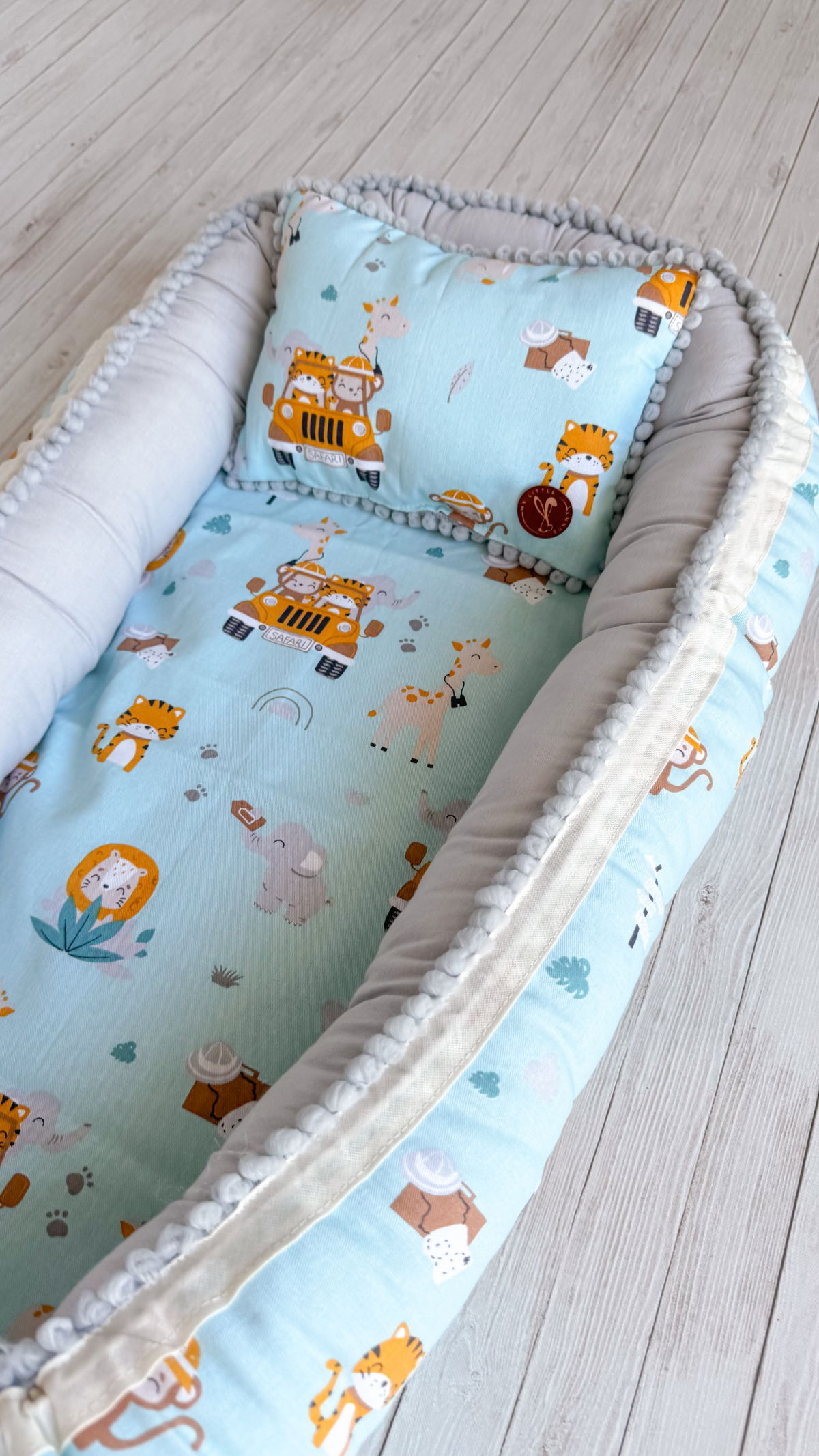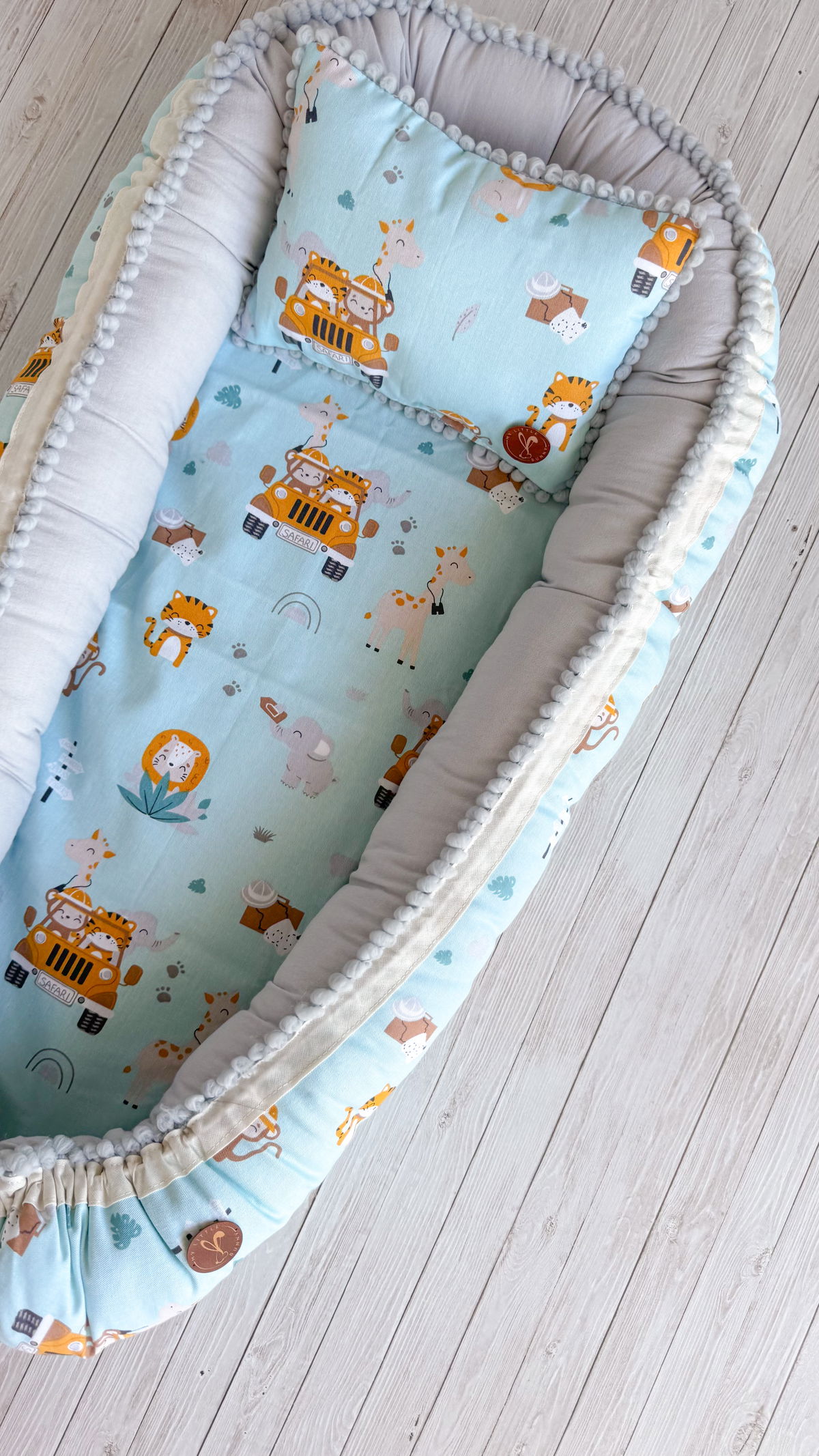 Tiene detalles como biez, cinta de doble razo y pompones, los terminales son 2 piezas rellenitas con cintitas haciendo juego con el nido.