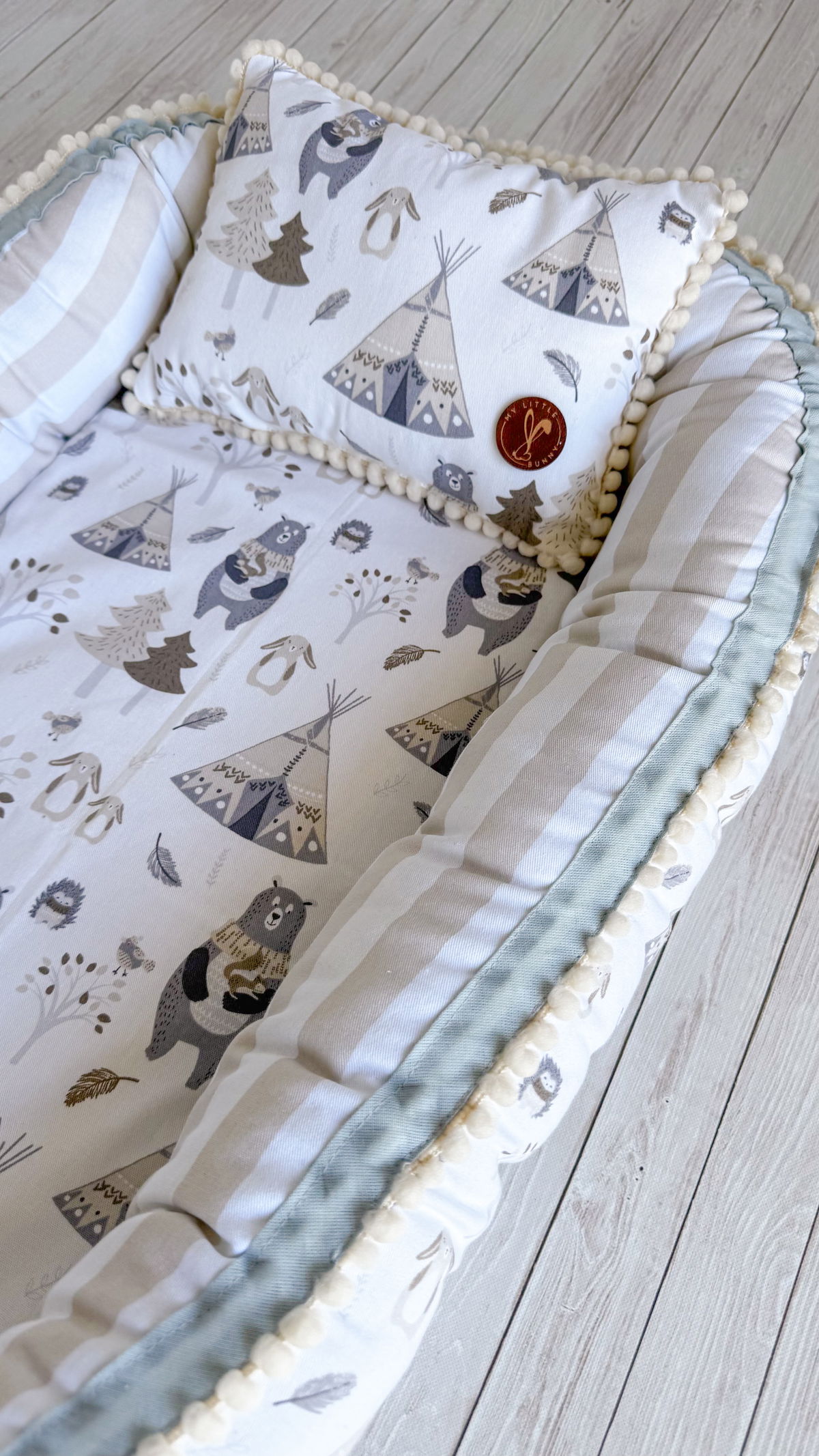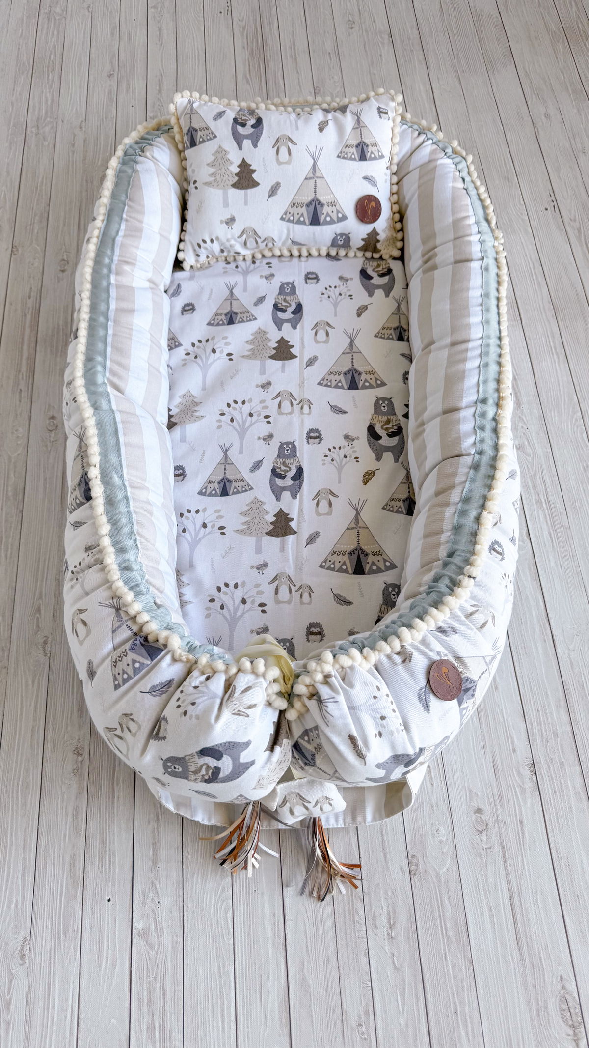 Tiene detalles como biez, cinta de doble razo y pompones, los terminales son 2 piezas rellenitas con cintitas haciendo juego con el nido.