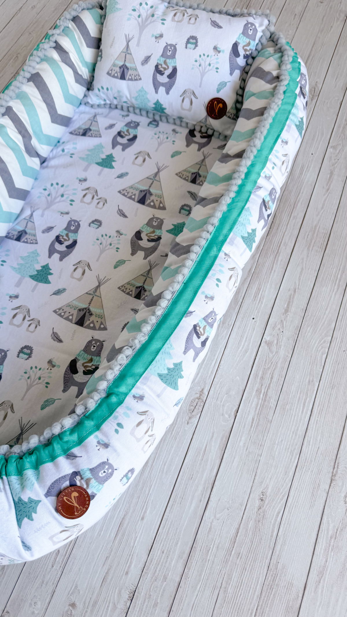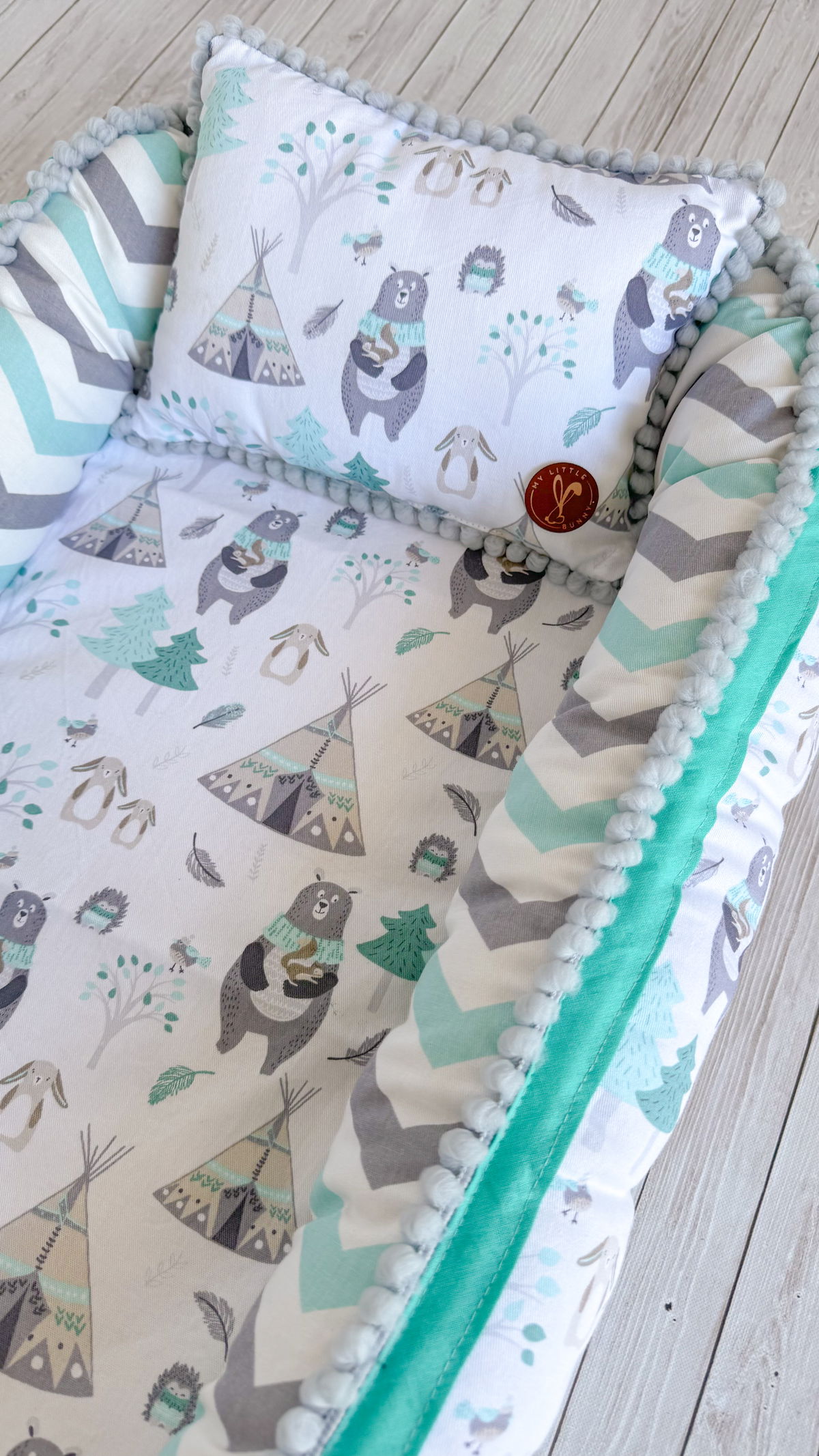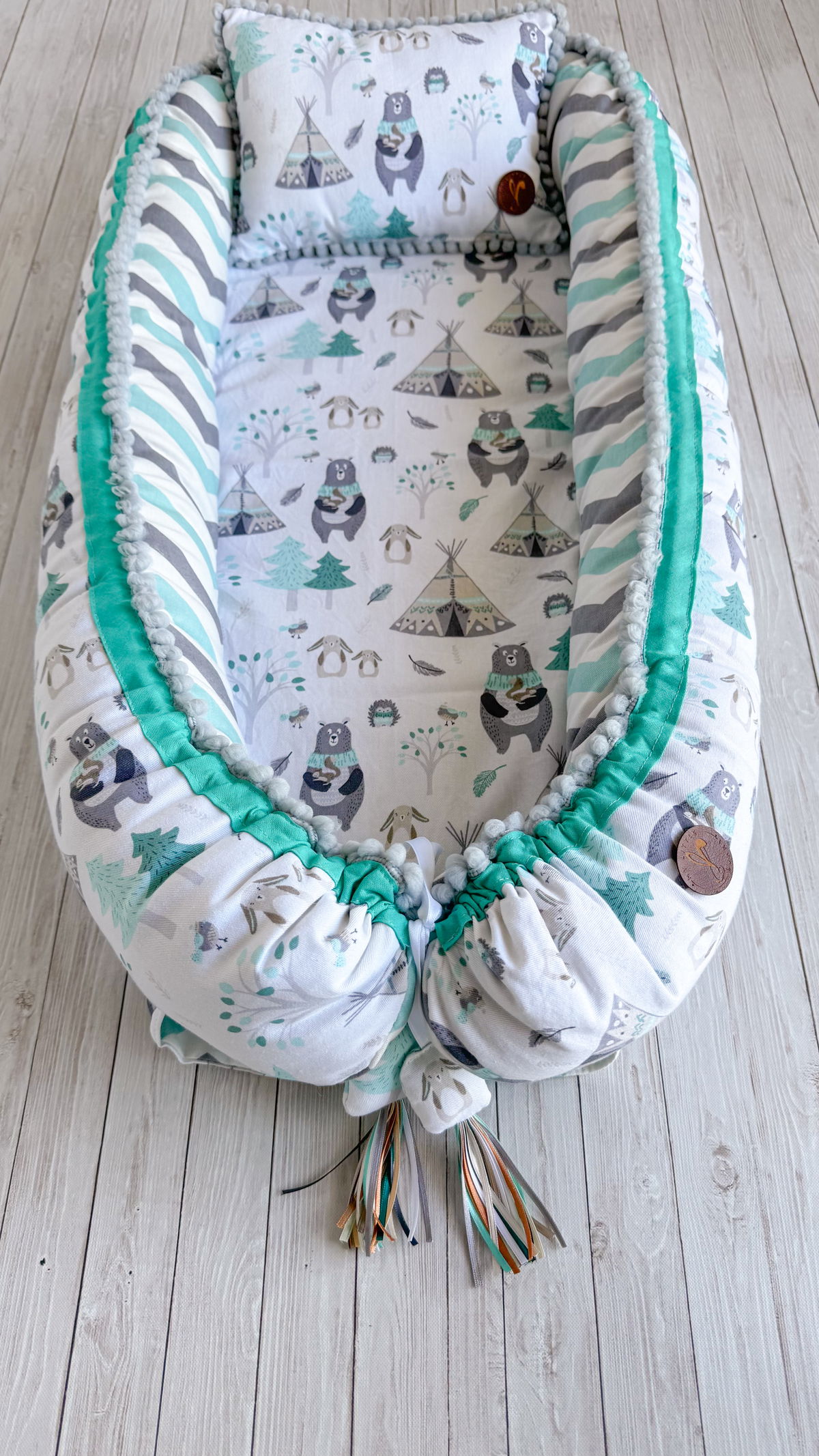 Tiene detalles como biez, cinta de doble razo y pompones, los terminales son 2 piezas rellenitas con cintitas haciendo juego con el nido.