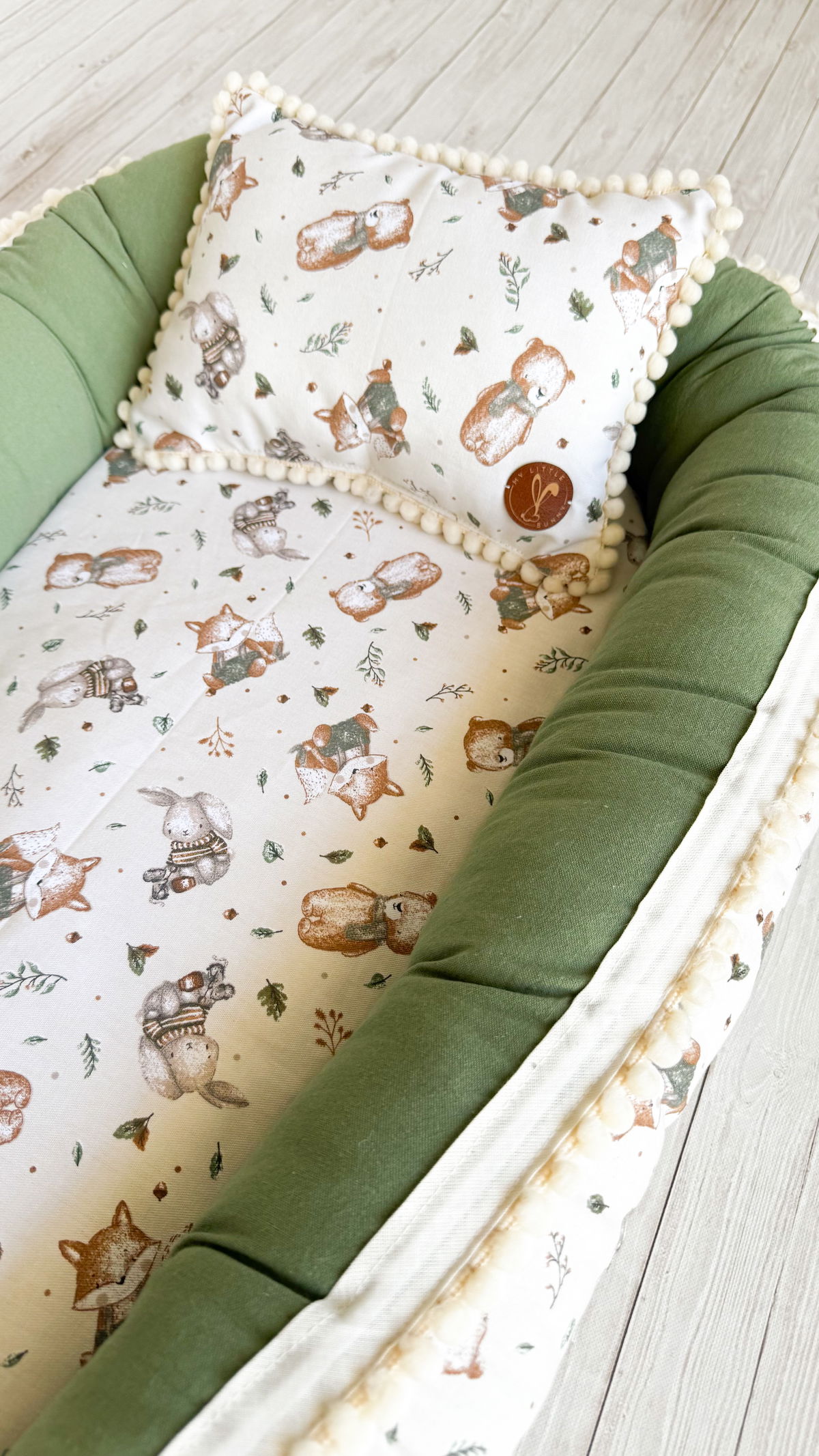 Tiene detalles como biez, cinta de doble razo y pompones, los terminales son 2 piezas rellenitas con cintitas haciendo juego con el nido.