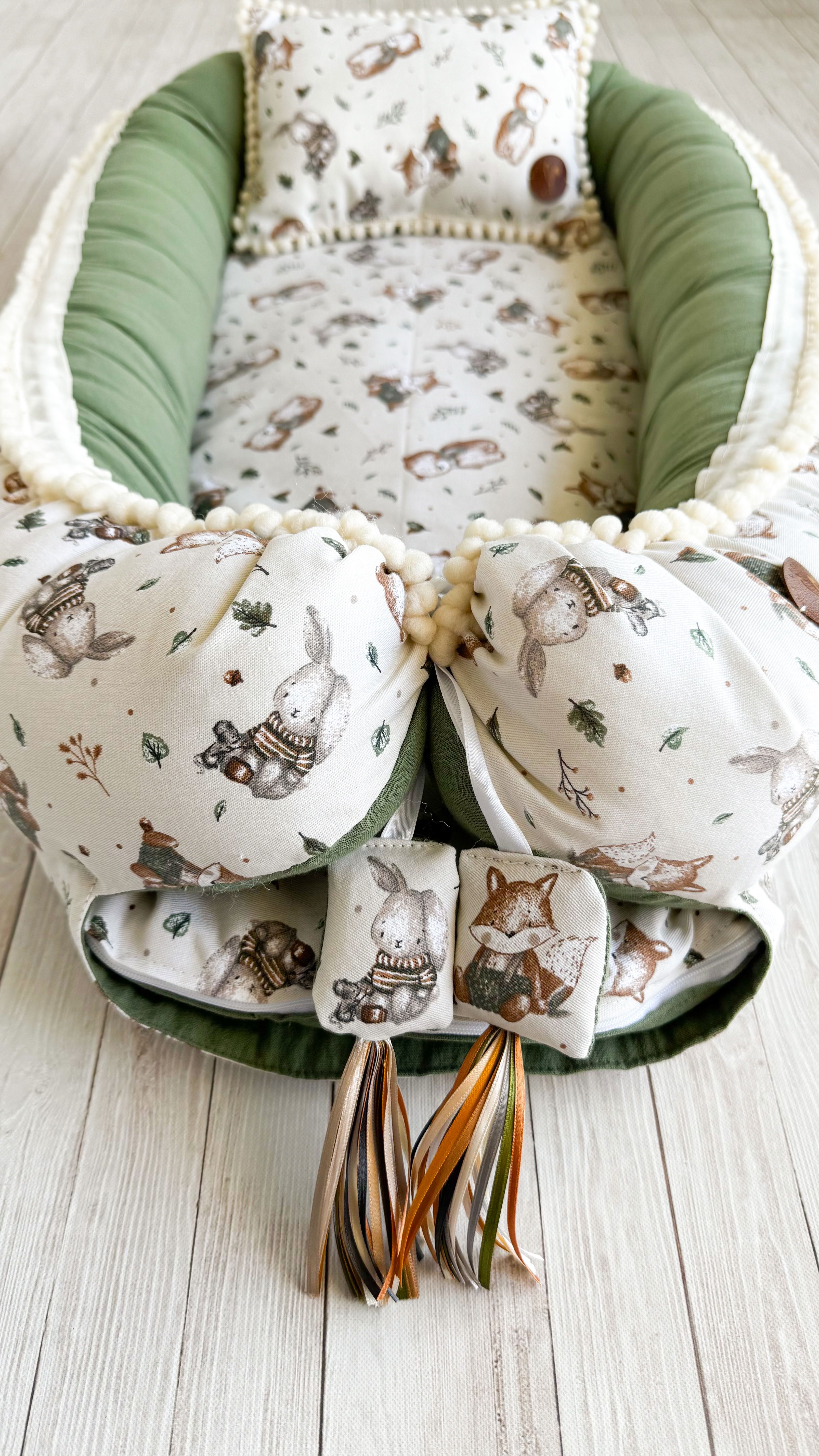 Tiene detalles como biez, cinta de doble razo y pompones, los terminales son 2 piezas rellenitas con cintitas haciendo juego con el nido.