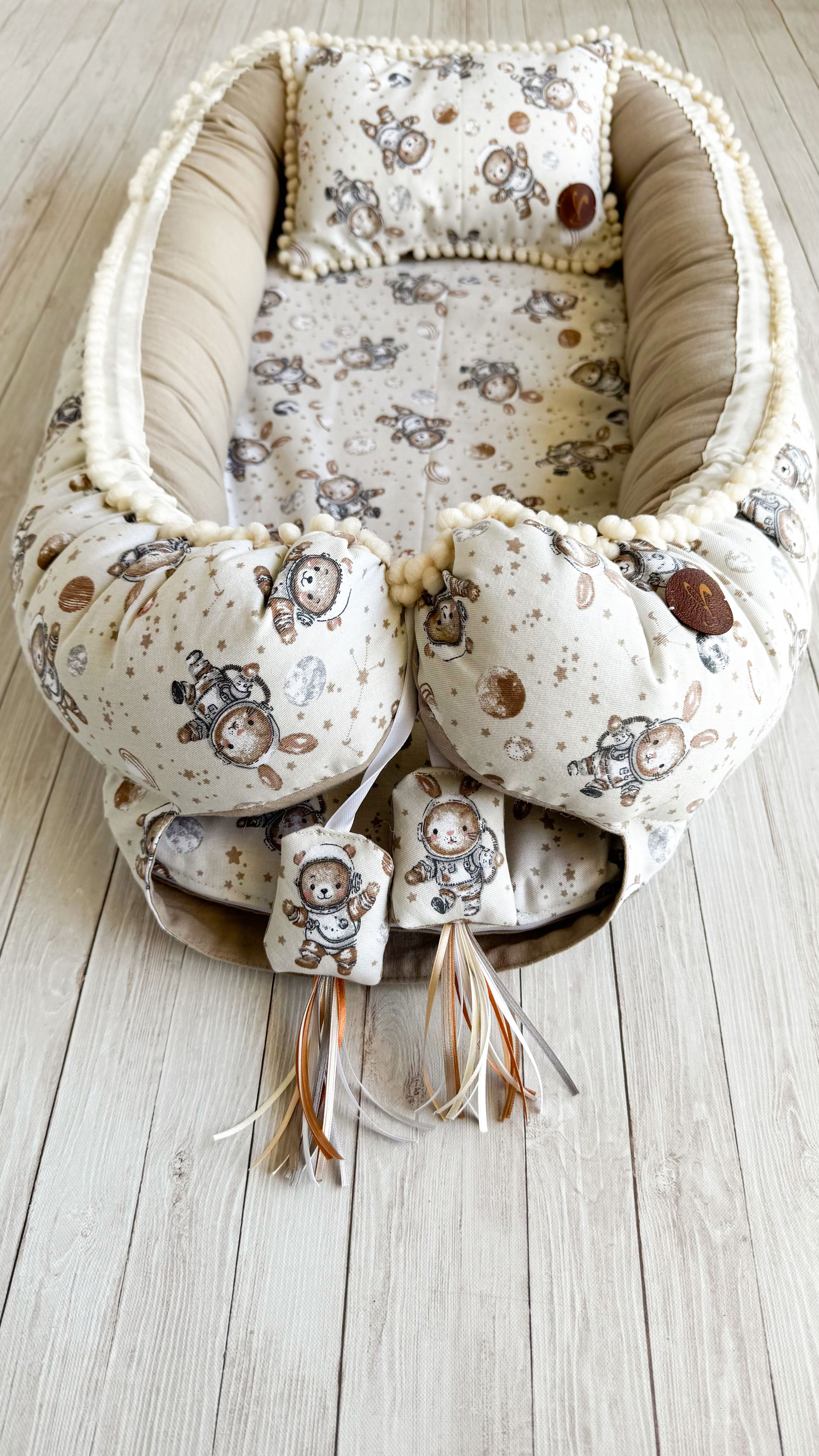 Tiene detalles como biez, cinta de doble razo y pompones, los terminales son 2 piezas rellenitas con cintitas haciendo juego con el nido.