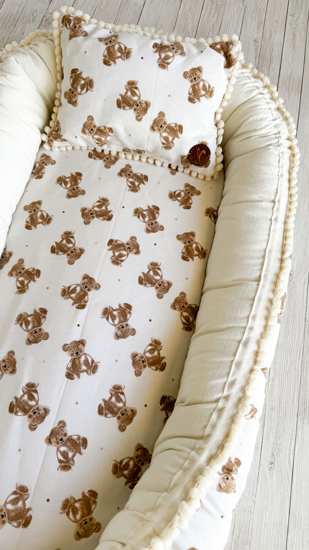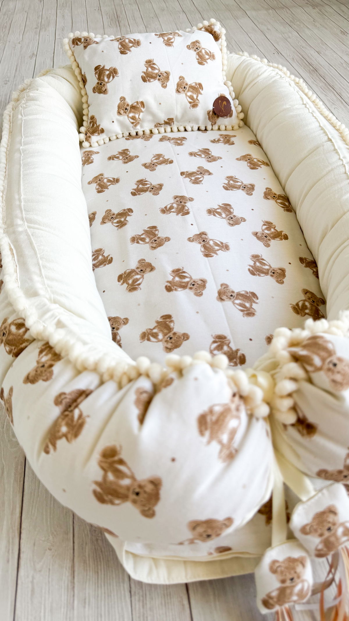Tiene detalles como biez, cinta de doble razo y pompones, los terminales son 2 piezas rellenitas con cintitas haciendo juego con el nido.