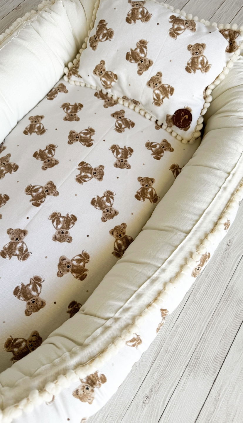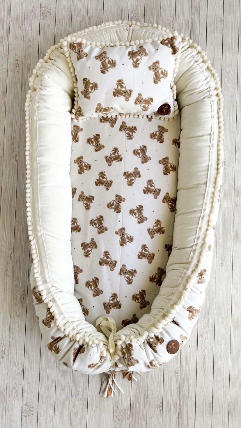 Tiene detalles como biez, cinta de doble razo y pompones, los terminales son 2 piezas rellenitas con cintitas haciendo juego con el nido.