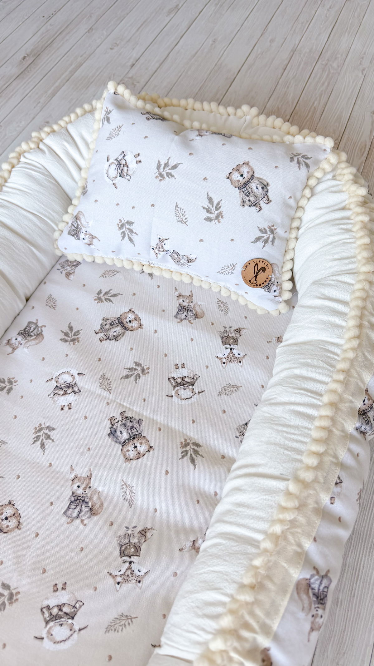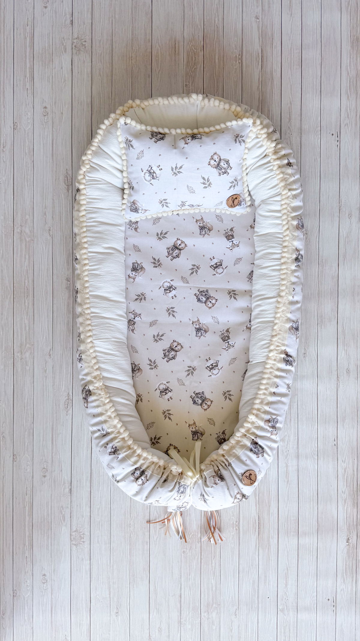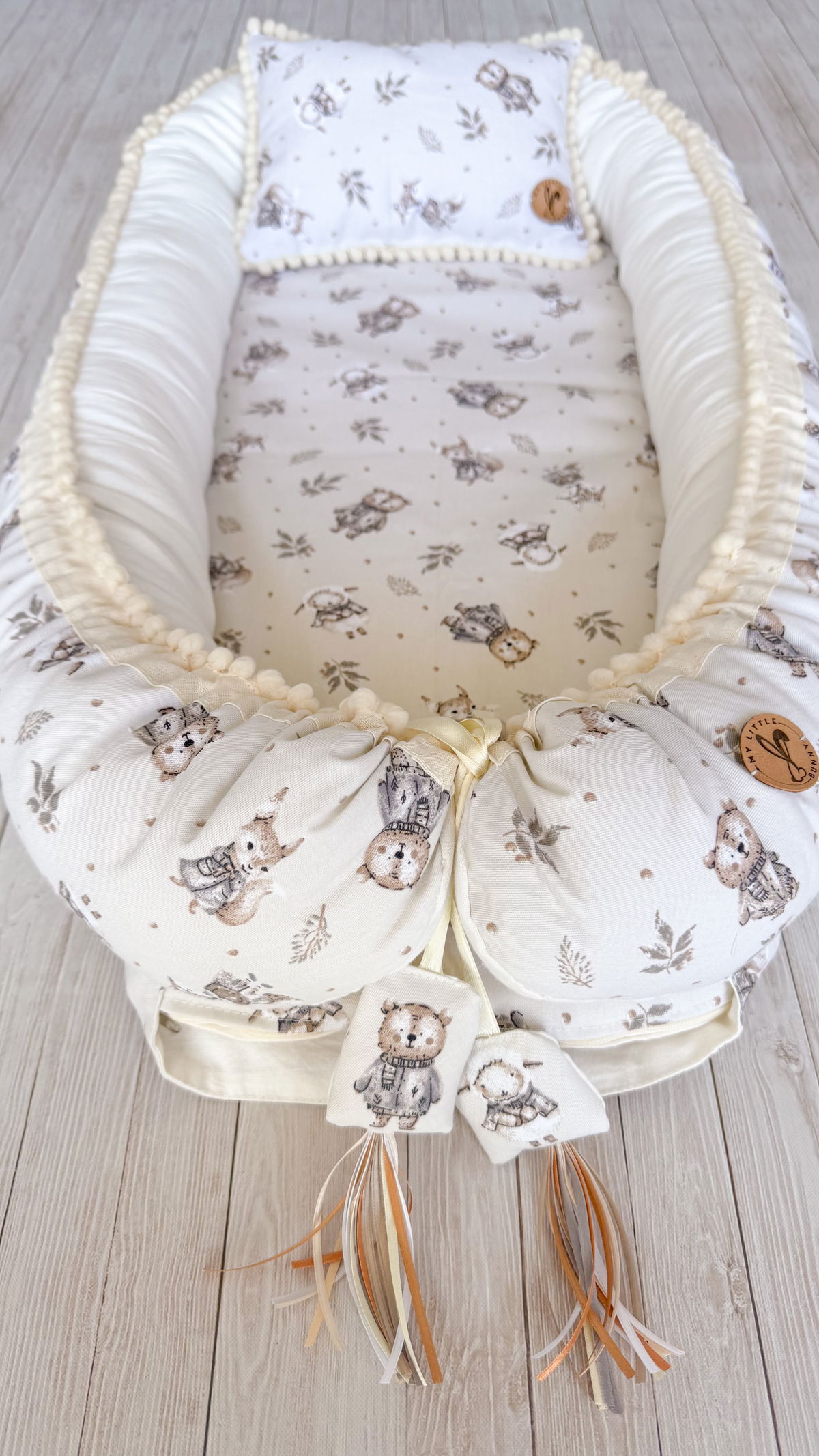 Tiene detalles como biez, cinta de doble razo y pompones, los terminales son 2 piezas rellenitas con cintitas haciendo juego con el nido.
