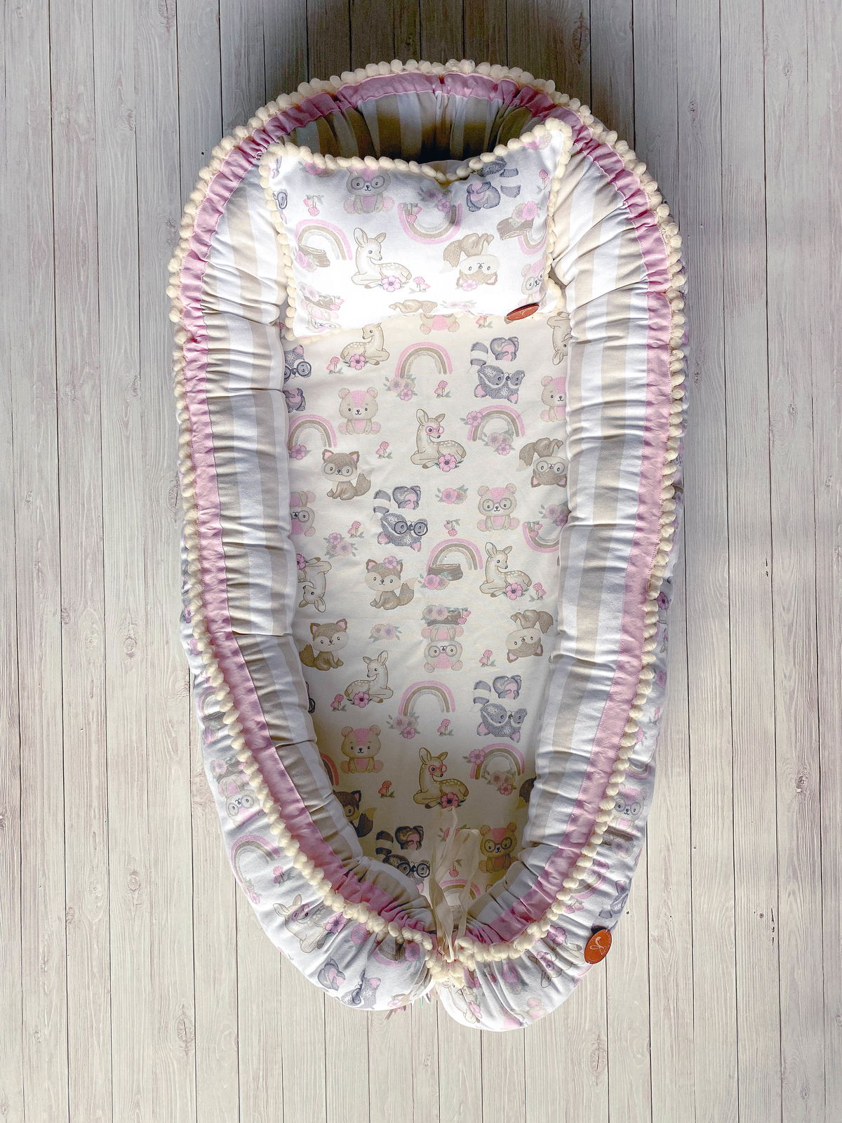 Tiene detalles como biez, cinta de doble razo y pompones, los terminales son 2 piezas rellenitas con cintitas haciendo juego con el nido.