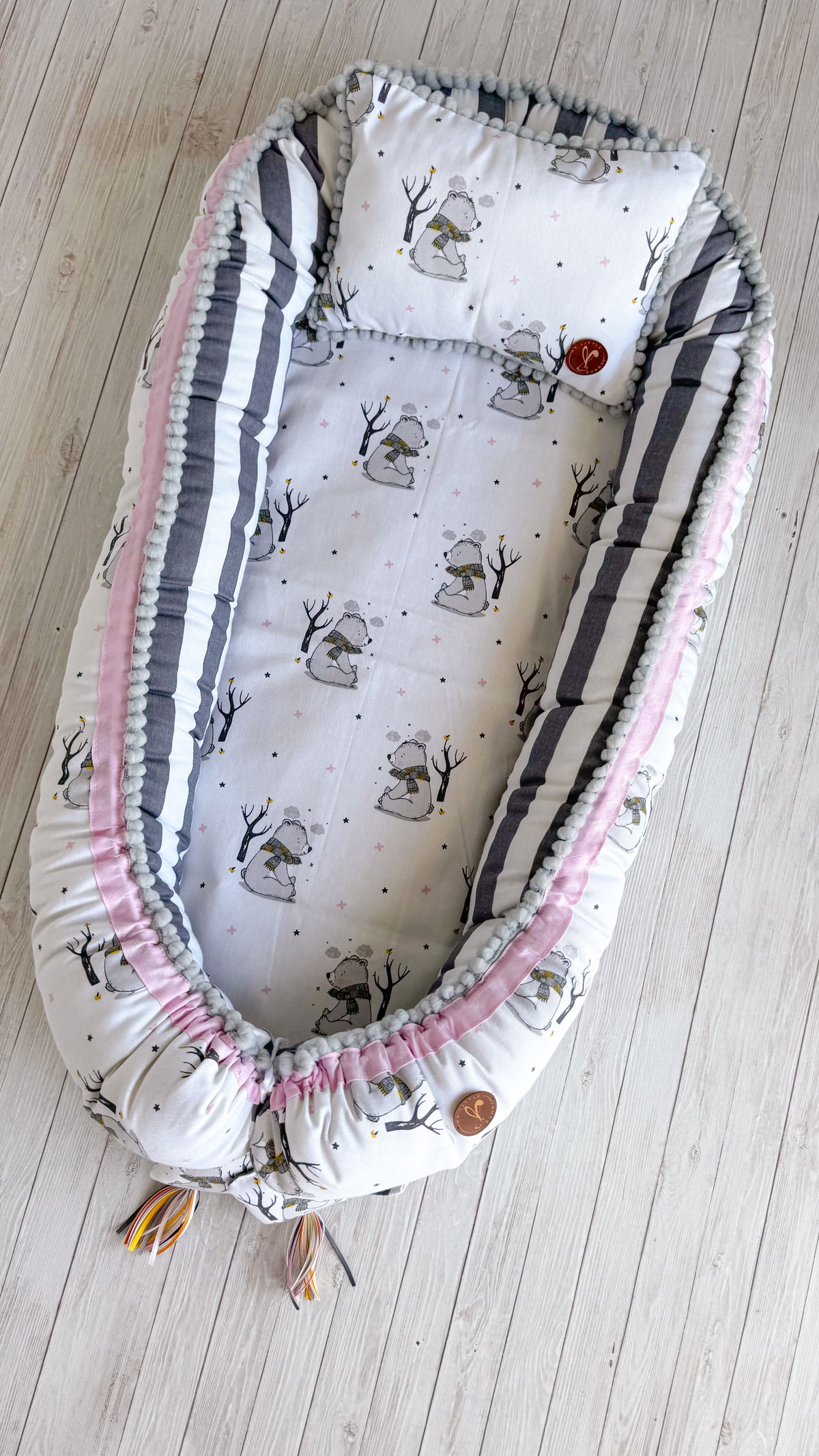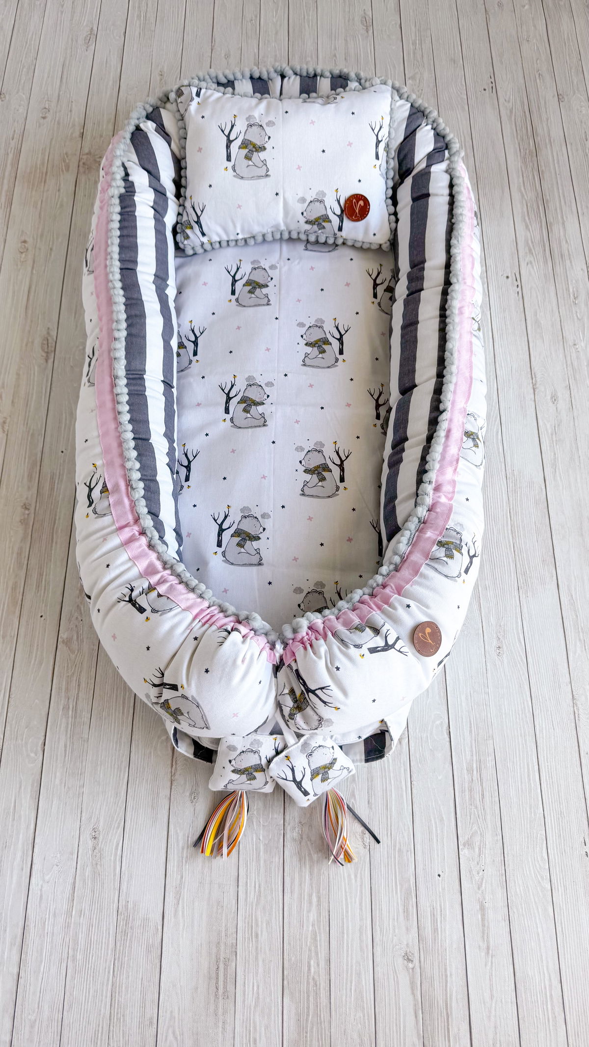 Tiene detalles como biez, cinta de doble razo y pompones, los terminales son 2 piezas rellenitas con cintitas haciendo juego con el nido.