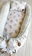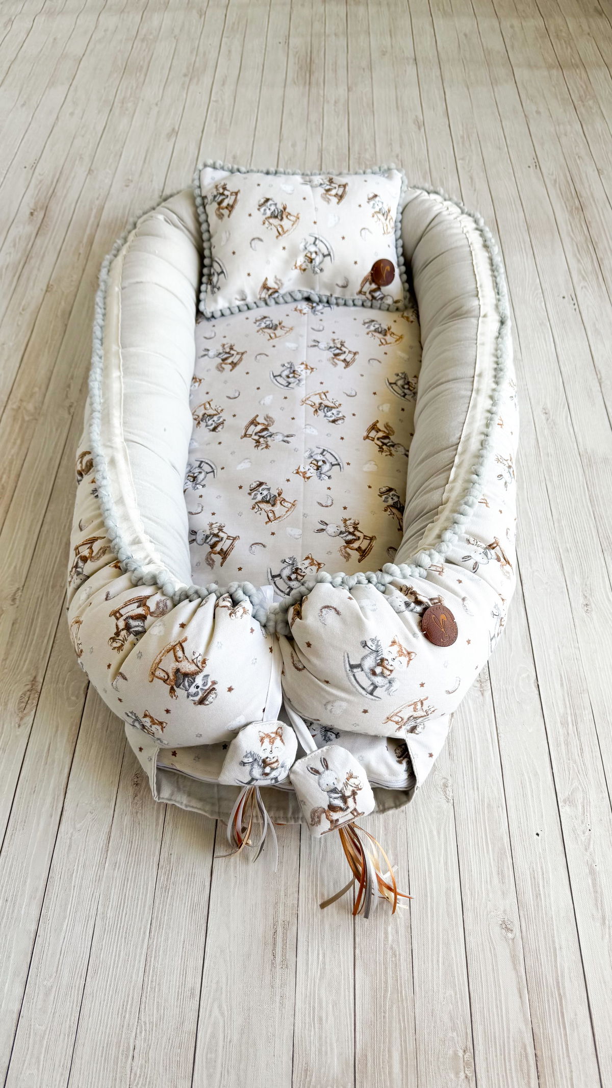 Tiene detalles como biez, cinta de doble razo y pompones, los terminales son 2 piezas rellenitas con cintitas haciendo juego con el nido.